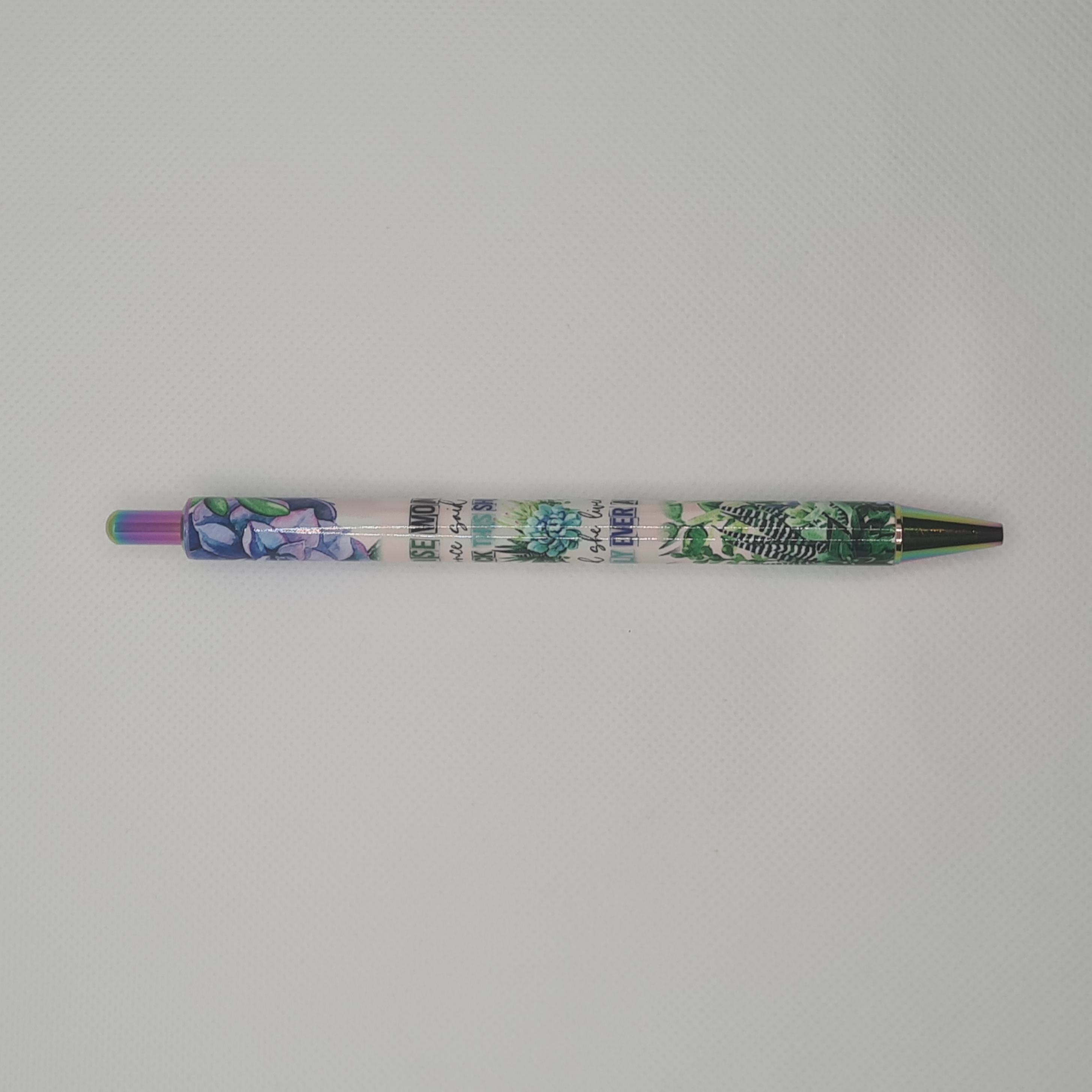 Design: White pen featuring the phrase “A wise woman once said fuck this shit and lived happily ever after” with leaves and purple flowers