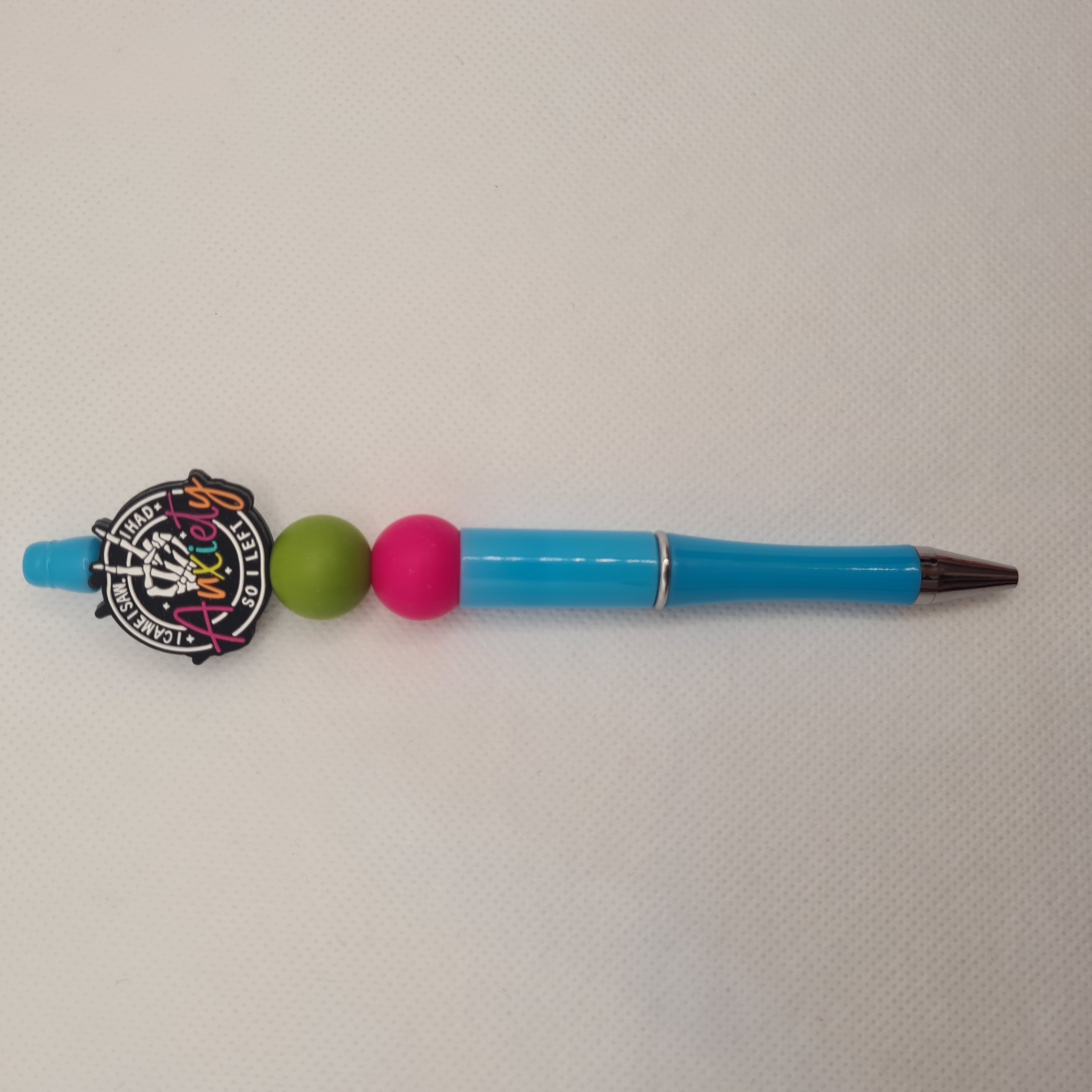 Add a touch of relatable humour to your stationery with the Anxiety Silicone Bead Pen. Featuring a blue pen barrel, this pen showcases a round focal bead with the phrase “I came, I saw, I had anxiety so I left,” paired with a skeletal hand making a peace sign. Green and pink silicone accent beads bring a pop of colour to the design, while smooth black ink makes it ideal for everyday writing, journaling, or note-taking.