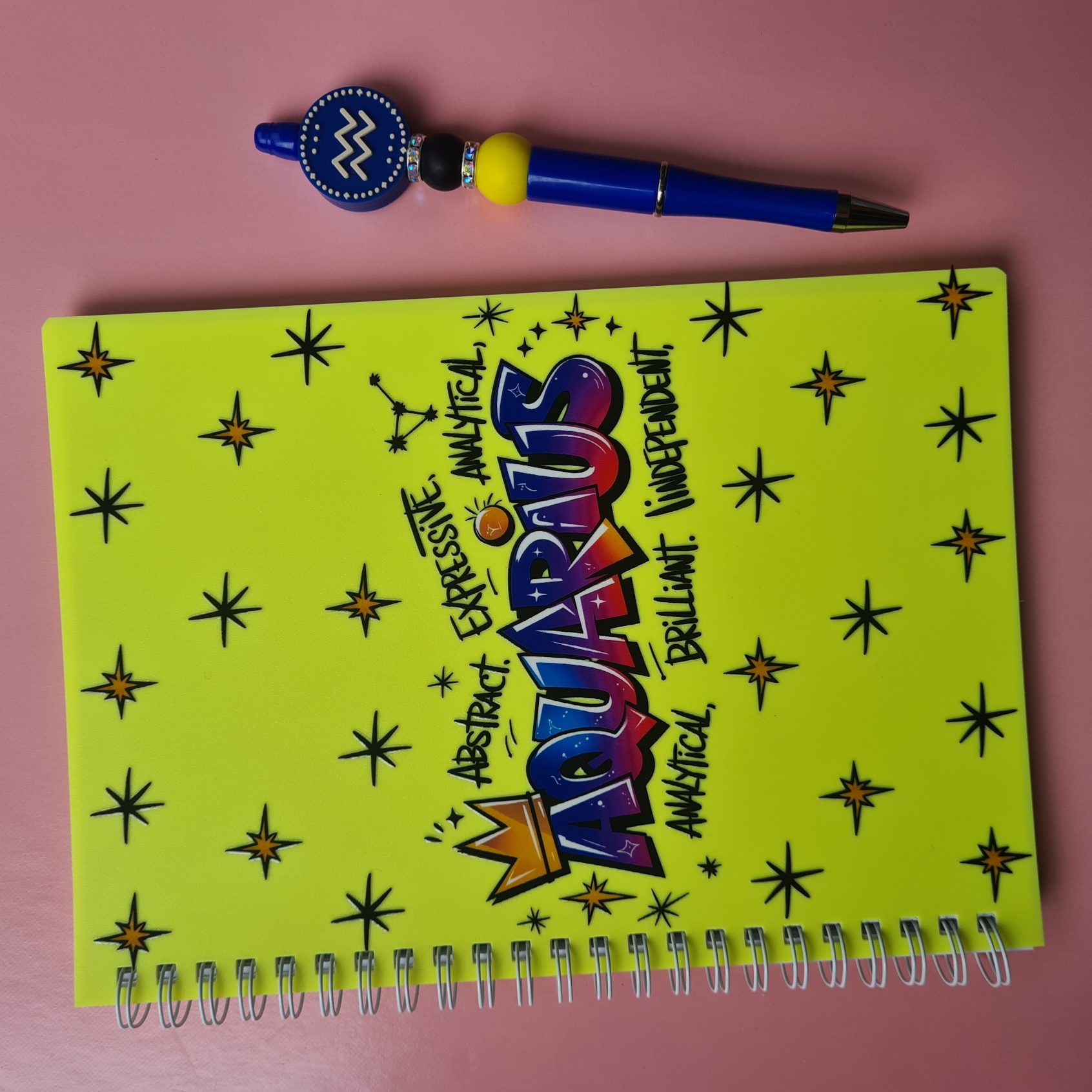 Innovative and expressive, the Aquarius Notebook and Pen Bundle is perfect for creative thinkers. This A5-sized yellow notebook features Aquarius surrounded by abstract, expressive, analytical, independent, and brilliant.