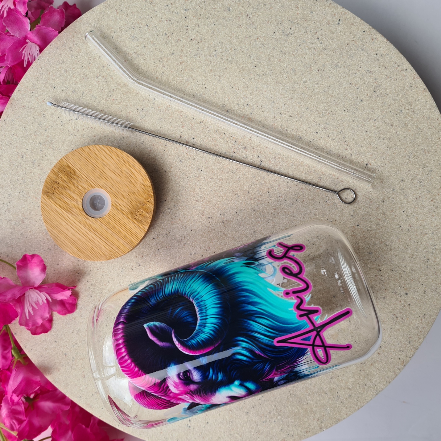 Celebrate your zodiac energy with our Aries Glass Cup. Holding 460ml and measuring 13.5cm tall by 7cm wide, this cup blends elegance with a pink and purple celestial theme, perfect for sipping in style.
