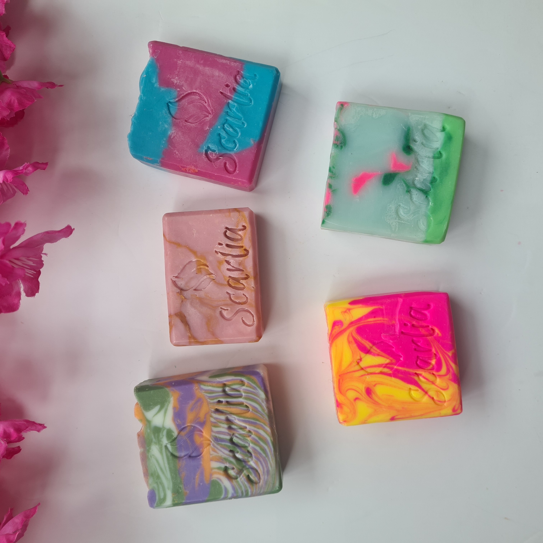 Enjoy a vibrant collection of scents and colours with our Bar Soap Bundle 4, featuring five beautifully handcrafted soaps. Each bar is made with a luxurious blend of olive oil, coconut oil, shea butter, cocoa butter, and castor oil, creating a creamy, moisturising lather that leaves your skin soft, smooth, and refreshed. This bundle is perfect for gifting or for anyone who loves variety in their daily routine.