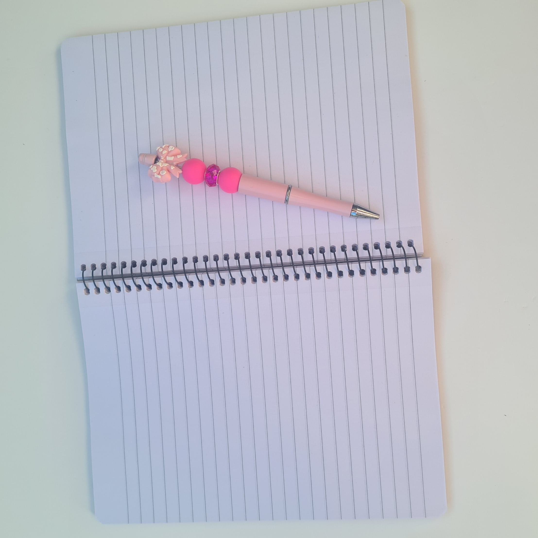 The bundle comes with a matching pink pen, finished with a pink bow bead with white spots and coordinating pink beads, creating the perfect pairing for the notebook’s bold and fun design. Together, this set is stylish, unique, and guaranteed to stand out.
