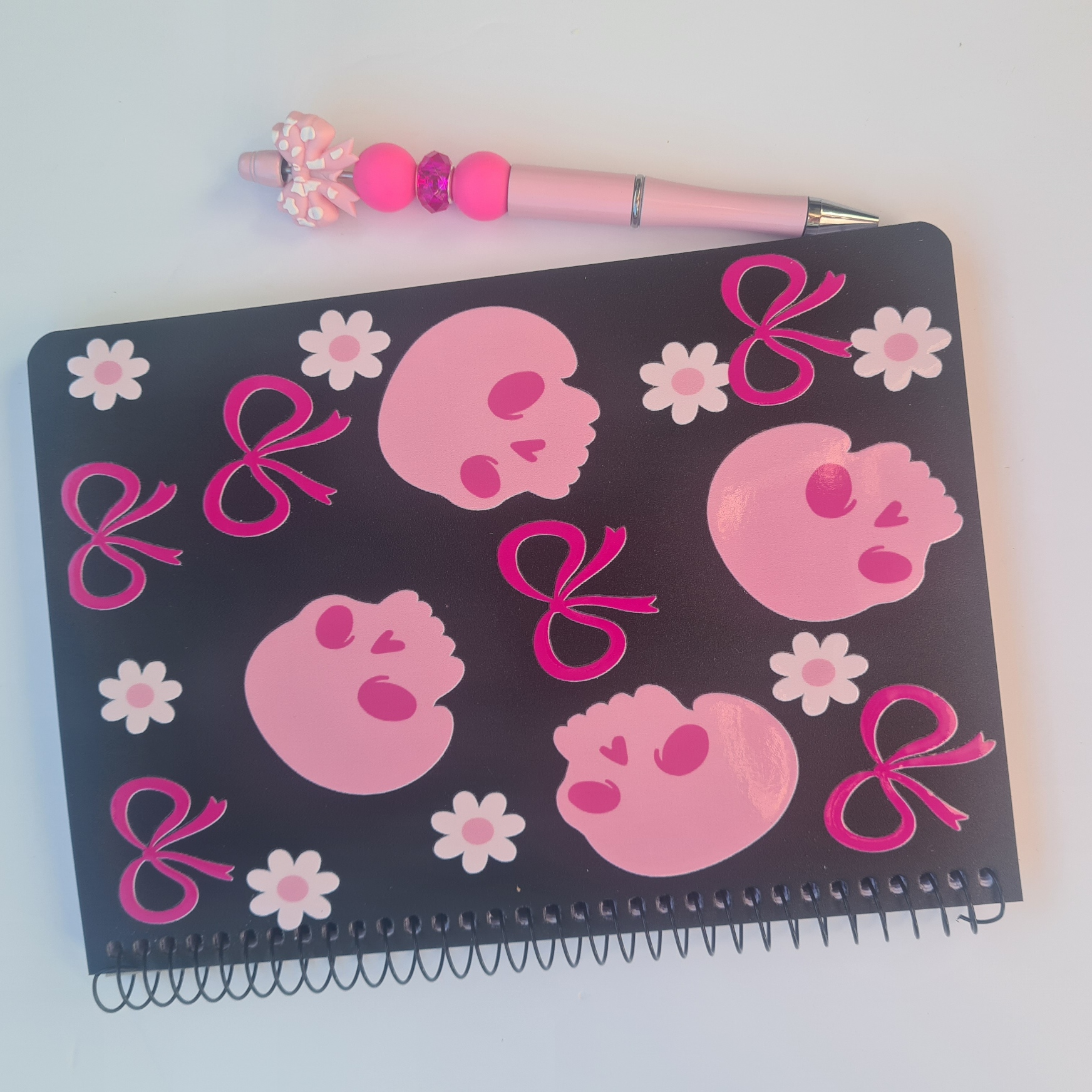 Notebook Design: Black A5 notebook featuring pink bows, cartoon-style pink skulls, and pink daisies