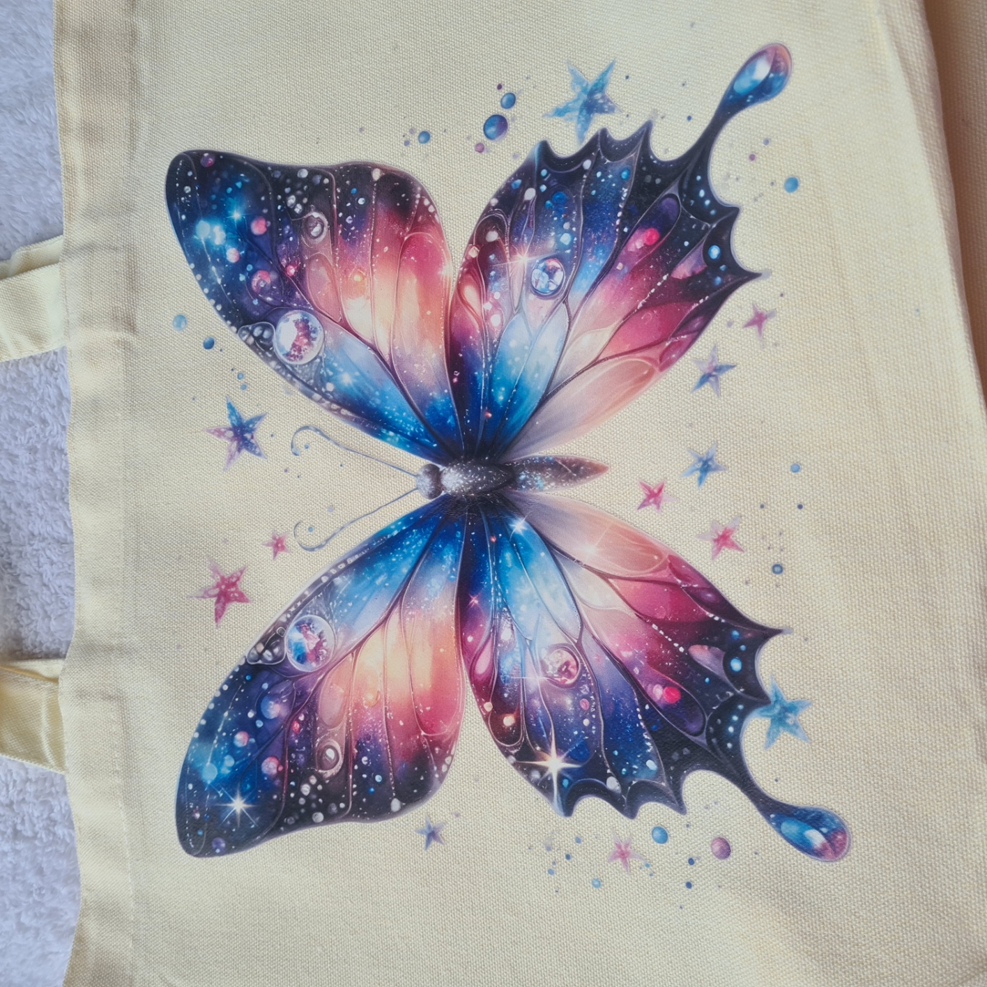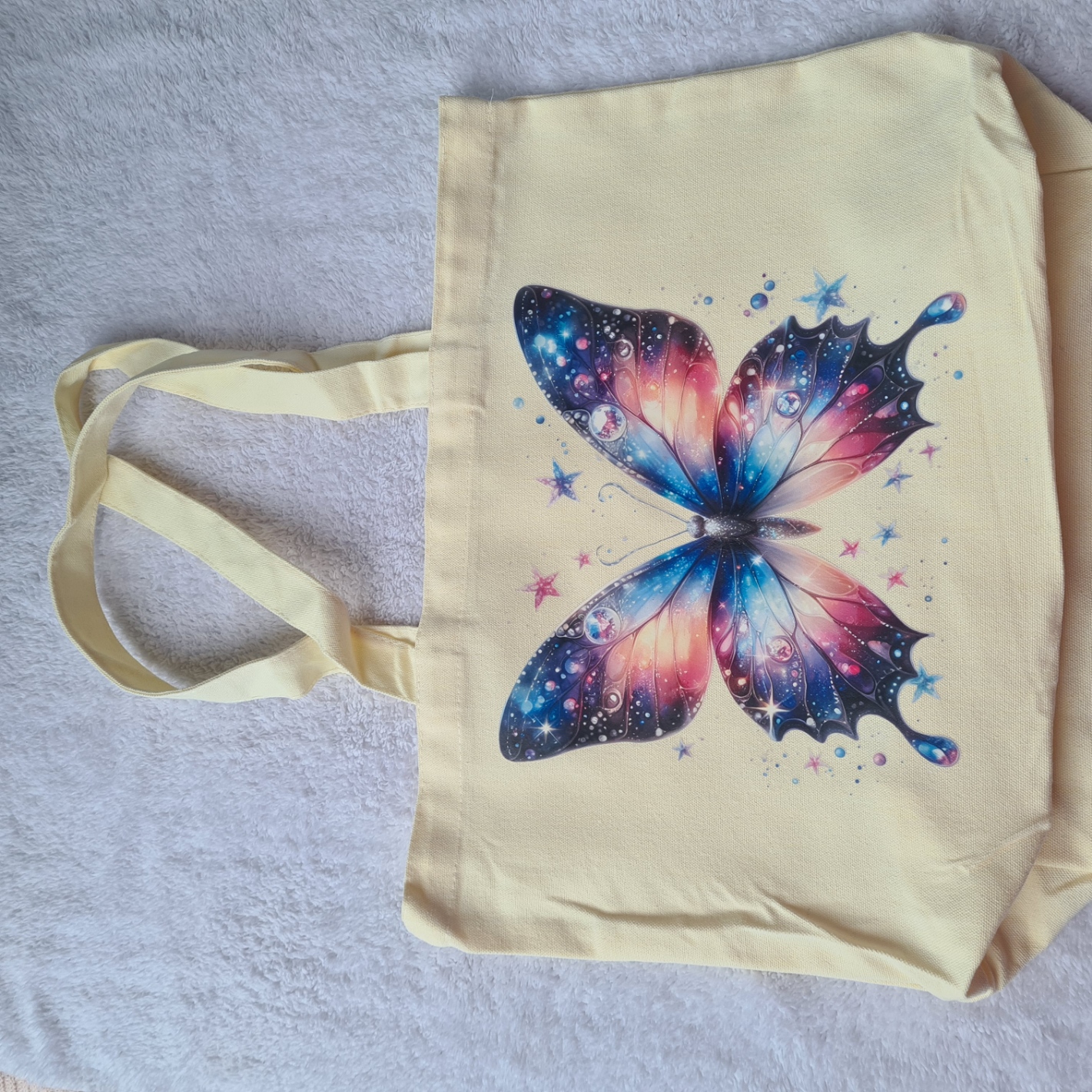 Bring a touch of whimsy to your everyday with the Butterfly Tote Bag! Featuring a large butterfly in soft blue and pink tones, surrounded by twinkling stars, this design is both dreamy and enchanting.