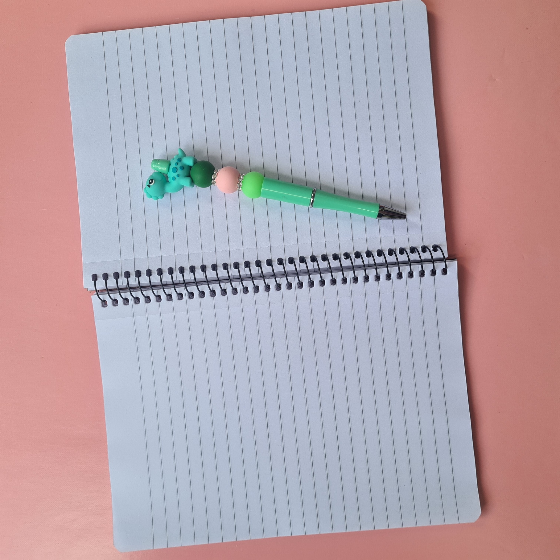 The set is completed with a coordinating green pen, featuring a cute dinosaur bead and green and pink accent beads, tying the theme together in the most charming way. Perfect for students, dinosaur lovers, or anyone who enjoys quirky and whimsical stationery.