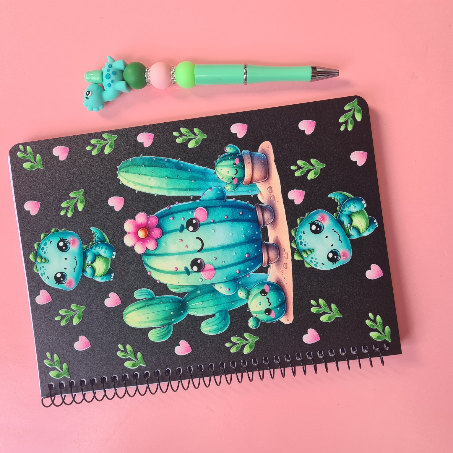 Add a playful twist to your stationery collection with the Cactus and Dinosaur Notebook and Pen Bundle! This black A5 notebook is decorated with adorable cacti and dinosaurs, surrounded by leaves and hearts for a fun and cheerful design. With 200 lined pages, it’s perfect for journaling, note-taking, or doodling your next big idea.