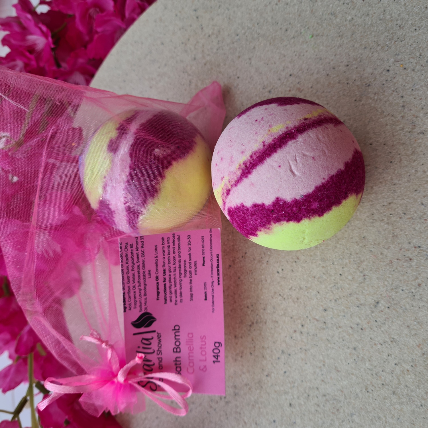 Immerse yourself in serenity with our Camellia and Lotus Bath Bomb, fragranced with a delicate floral blend that creates a soothing, spa-like bath experience. This luxurious bomb transforms your soak into a moment of calm and indulgence.