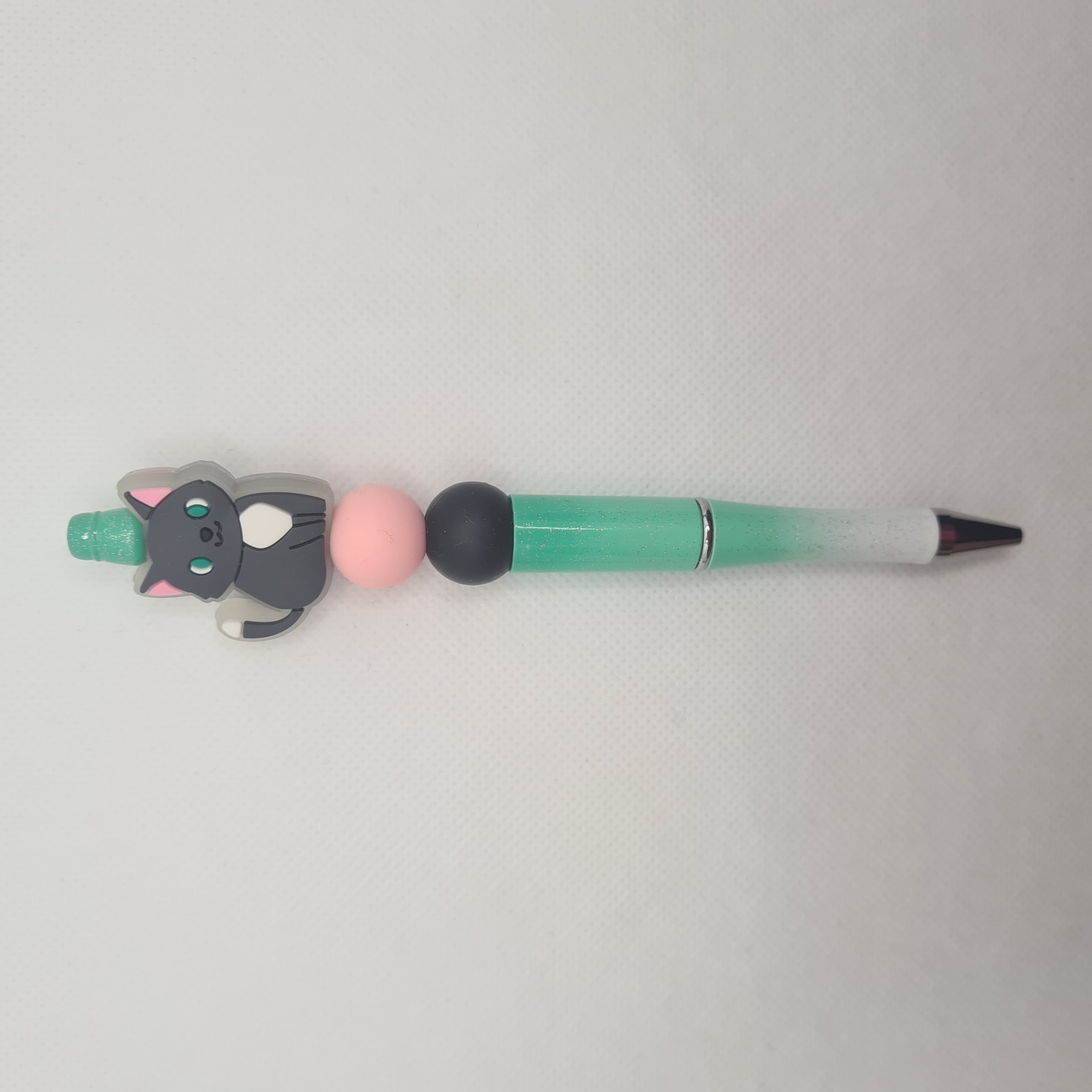 Add a playful touch to your writing with the Cat Silicone Bead Pen. Featuring a green and white ombre pen barrel, this pen showcases a charming dark grey cat-shaped focal bead that’s perfect for feline lovers. Complemented by pink and black silicone accent beads, it writes smoothly in black ink while adding a cute and quirky flair to your stationery collection.