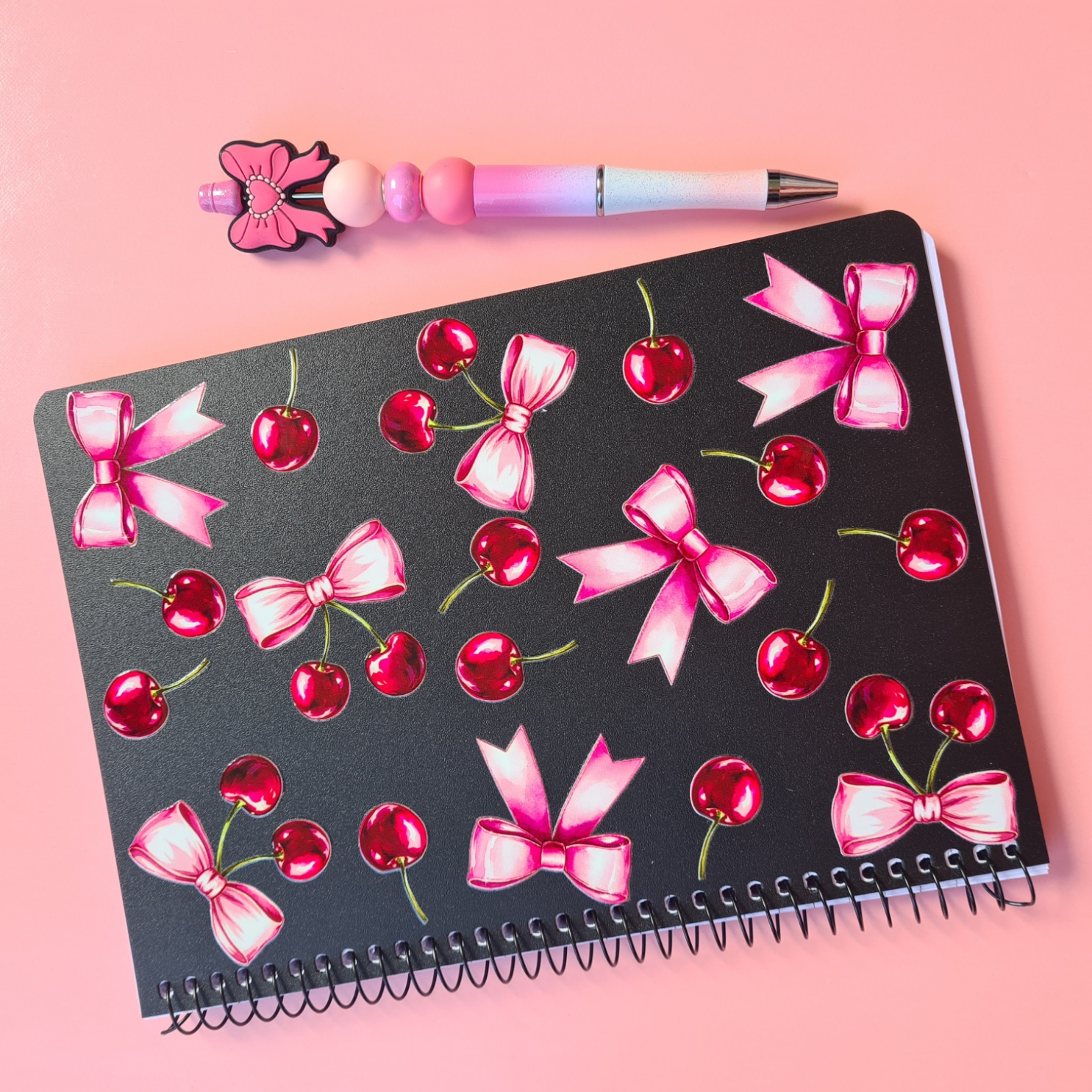 Notebook Design: Black notebook with red cherries and pink bows for a fun, fruity look