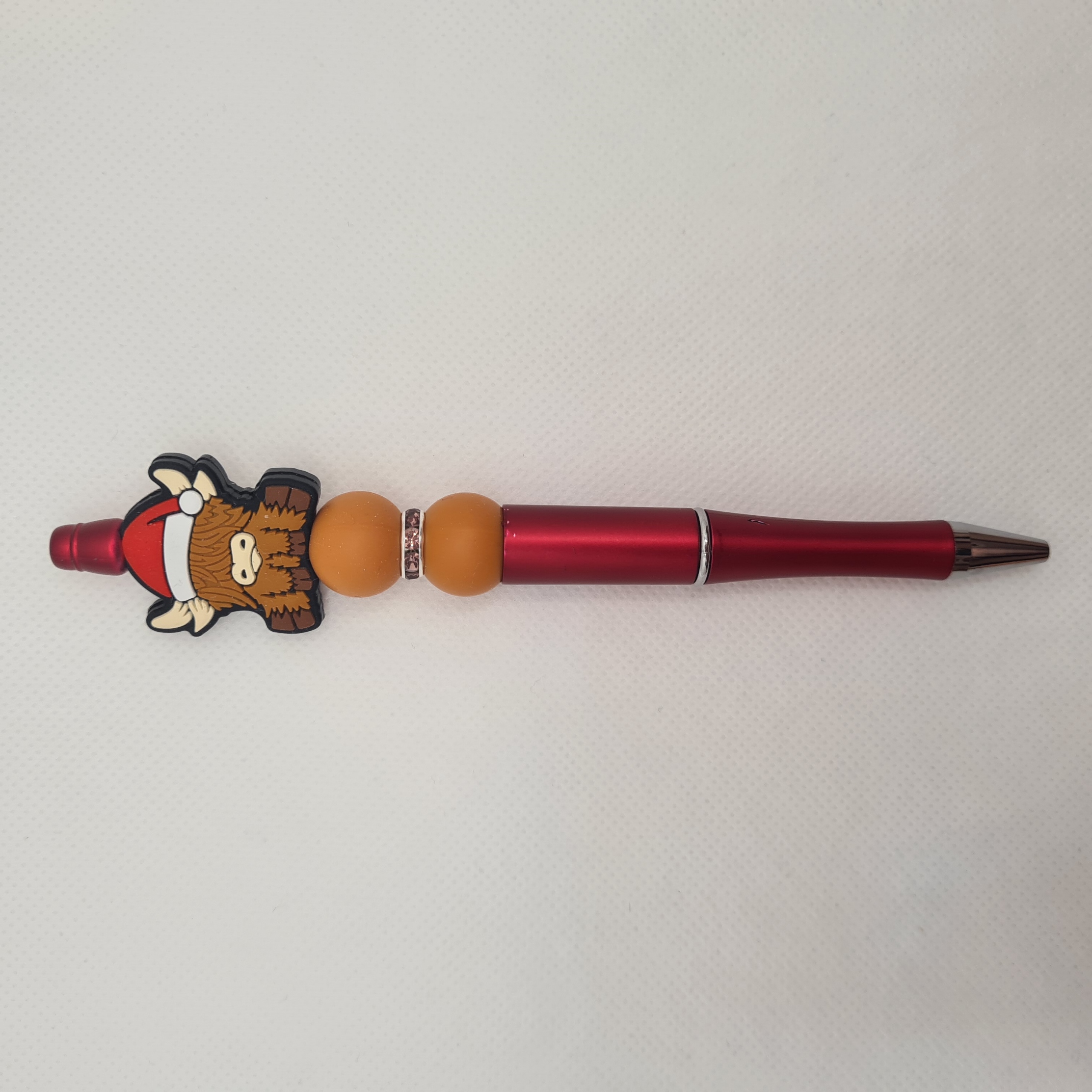 Add a festive farmyard charm to your writing with the Christmas Highland Cow Silicone Bead Pen. Featuring a vibrant red pen barrel, this pen showcases an adorable Highland cow focal bead dressed in a cheerful Santa hat. Complemented by brown and tan silicone accent beads, it writes smoothly in black ink while bringing a warm and whimsical Christmas touch to your stationery collection.