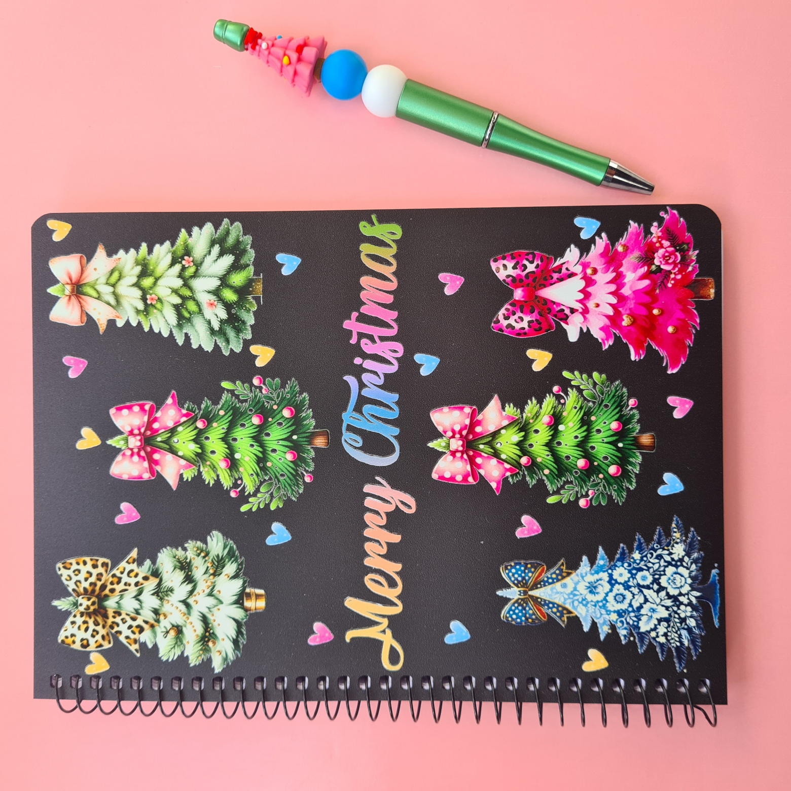 Notebook Design: A5 black spiral notebook with colourful Merry Christmas text, bow-topped Christmas trees in green, pink, and blue, and heart accents