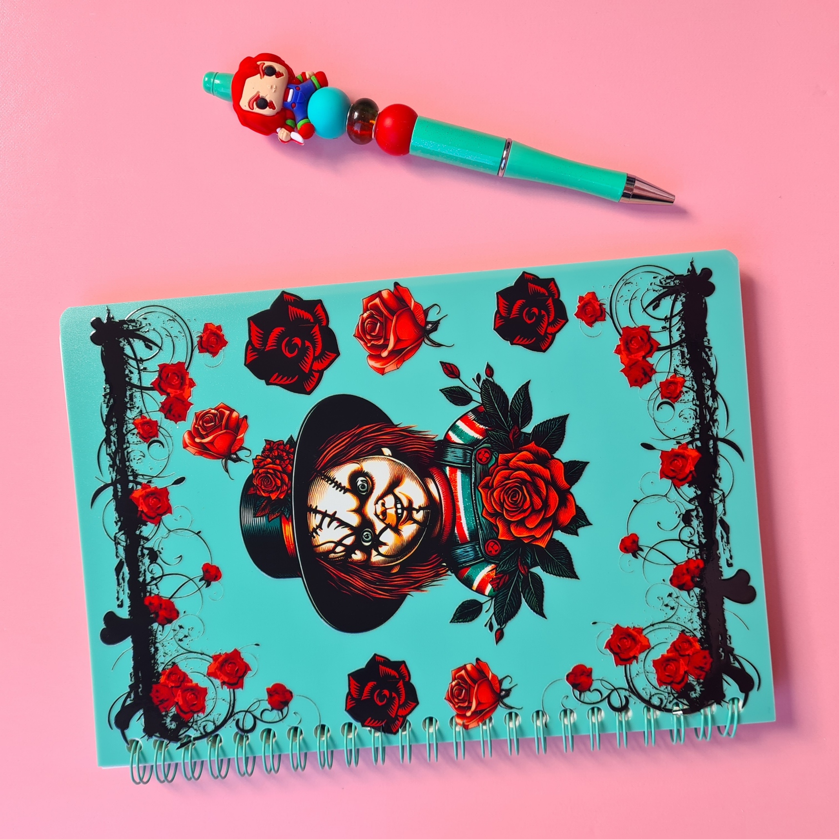 Notebook Design: Green notebook with Chucky surrounded by red roses