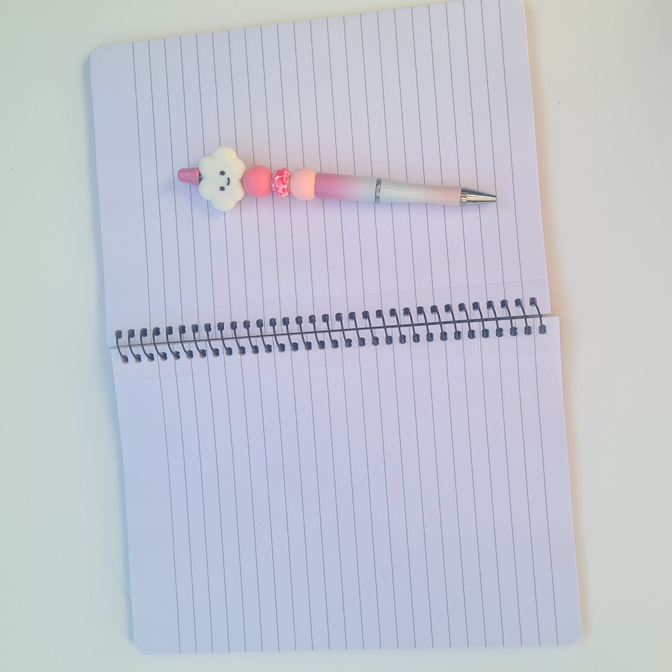 The bundle includes a matching pink and white ombre pen, designed with a cheerful cloud bead featuring a smiley face, paired with pink accent beads for a playful finish. Together, this set is both functional and fun—making writing feel a little lighter.