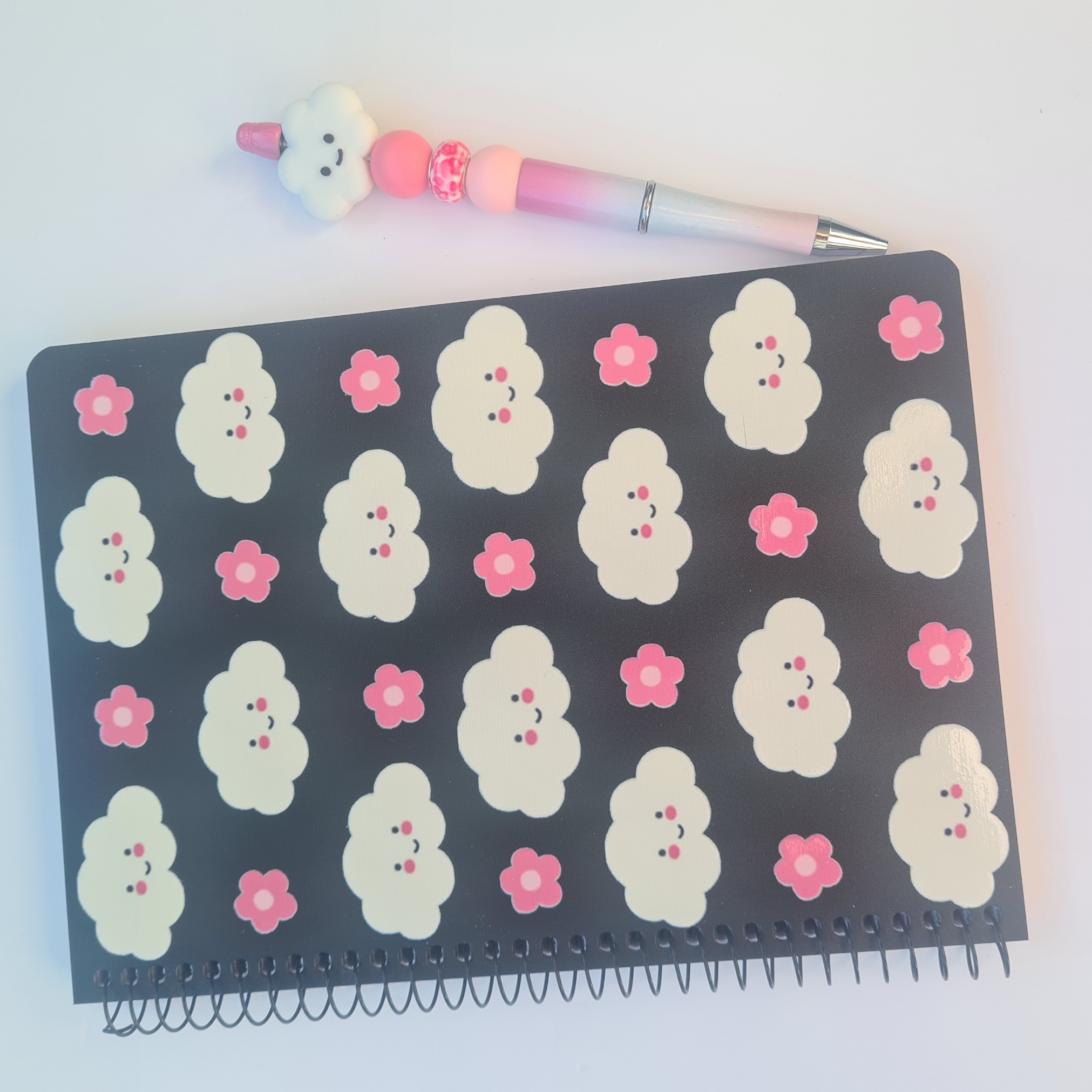 Notebook Design: Black A5 notebook with smiling clouds and pink flower details