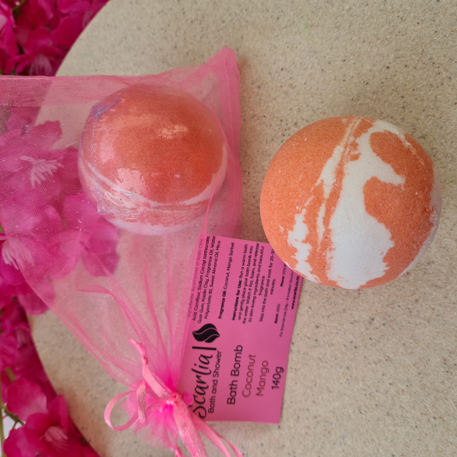 Ingredients: Bicarbonate of Soda, Citric Acid, Cornflour, Sodium Cocoyl Isethionate, Guar Gum, Kaolin Clay, Fragrance Oil (Coconut, Mango Sorbet), Water, Polysorbate 80, Sweet Almond Oil, Mica.