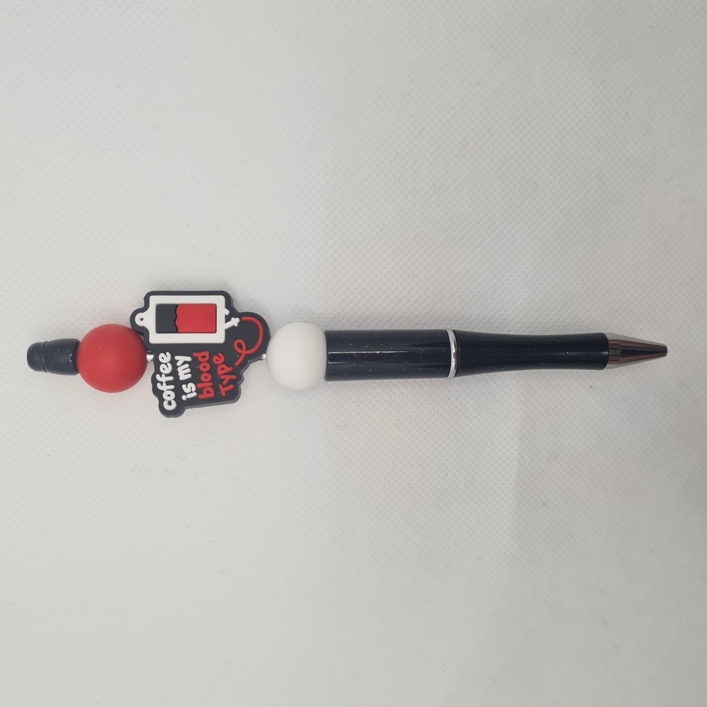 Fuel your writing with a dose of caffeine humour with the Coffee Is My Blood Type Silicone Bead Pen. Featuring a sleek black pen barrel, this pen showcases a round focal bead with the phrase “Coffee Is My Blood Type” alongside a playful blood bag design. Red and white silicone accent beads complete the bold colour theme, while smooth black ink makes it perfect for everyday writing, journaling, or note-taking.