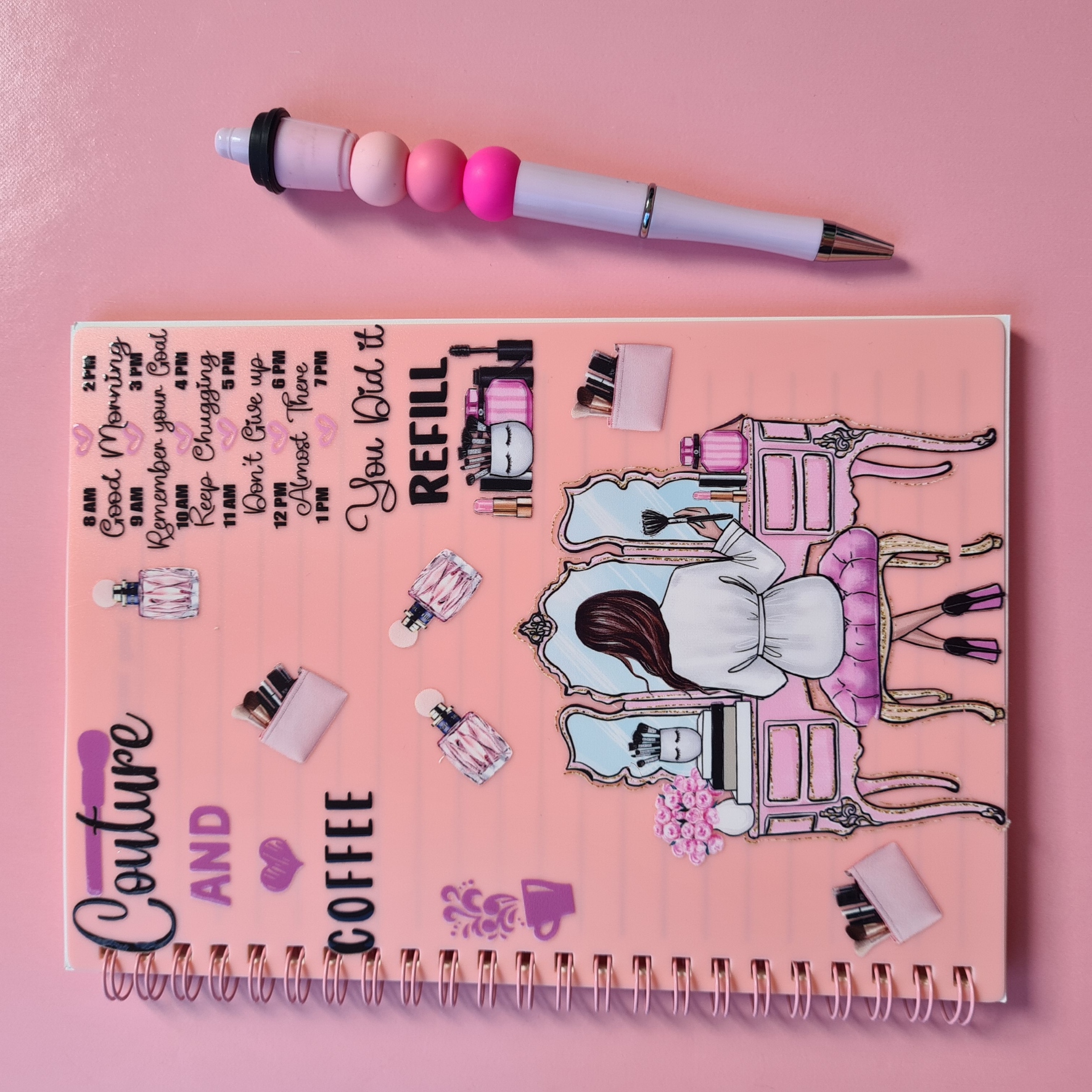 Notebook Design: Peach cover with “Couture and Coffee,” featuring a stylish lady, makeup bags, and perfume bottles