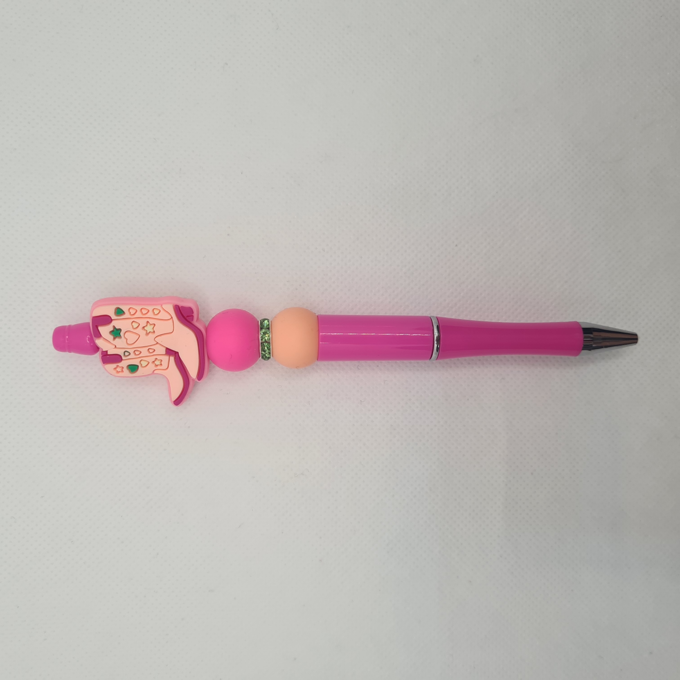 Add a touch of western charm to your writing with the Cowgirl Silicone Bead Pen. Featuring a pink-coloured pen barrel, this pen showcases a focal bead with pink cowgirl boots. Pink and peach coloured silicone accent beads add a fun pop of colour, while smooth black ink makes it perfect for everyday writing, journaling, or note-taking.