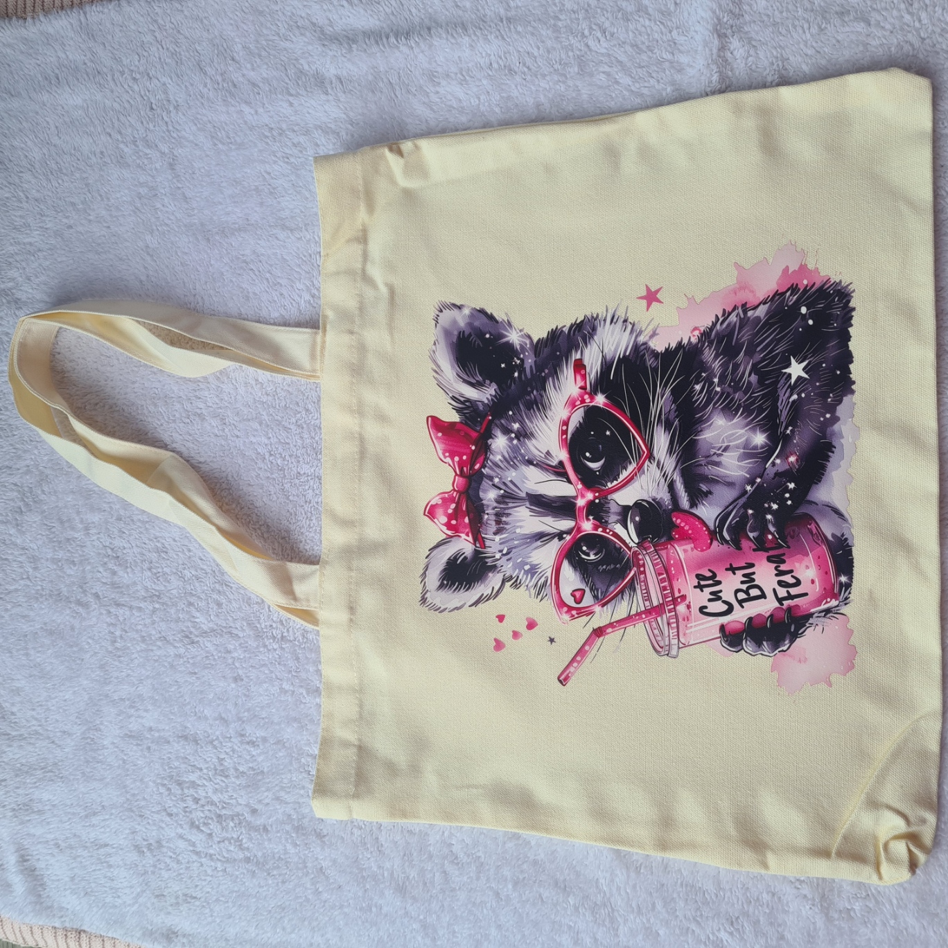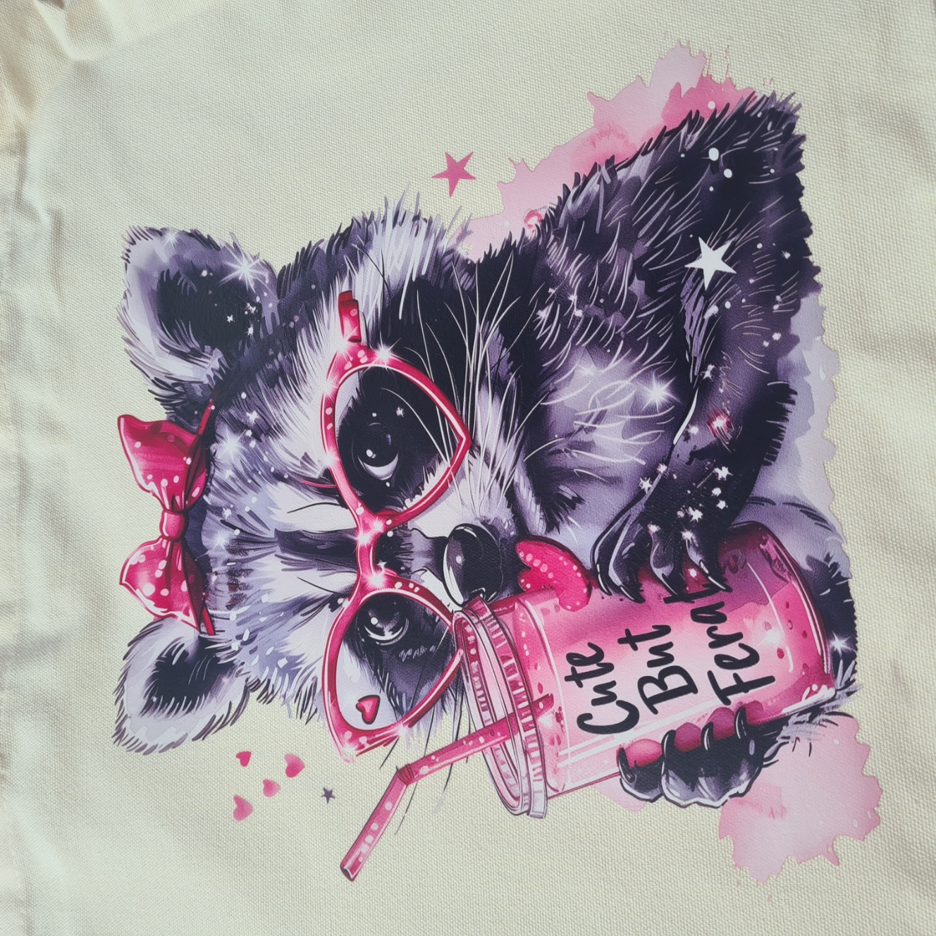 Show off your mischievous side with the Cute But Feral Tote Bag! Made from durable canvas, it features a raccoon wearing pink glasses and a bow, holding a pink drink that says “Cute But Feral”. This tote perfectly blends cuteness with attitude.