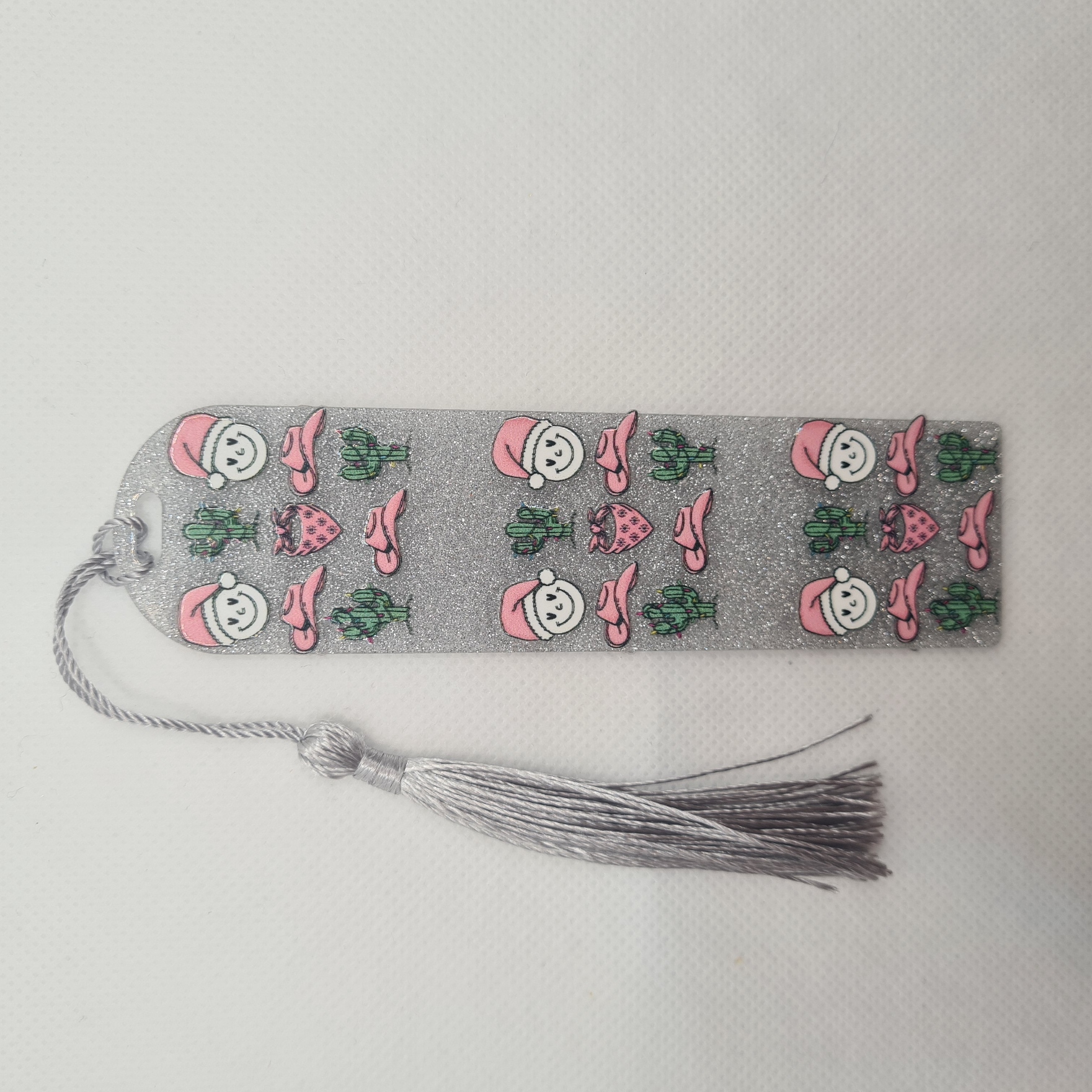 Add a little sass and sunshine to your reading with our Desert Vibes Bookmark. Set on a shimmering silver sparkly background, this fun design features a white smiley face wearing a pink Santa hat, along with pink cowboy hats, bandanas, and cacti for the ultimate desert-meets-holiday vibe. Finished with a matching silver tassel, it’s bold, playful, and full of personality.