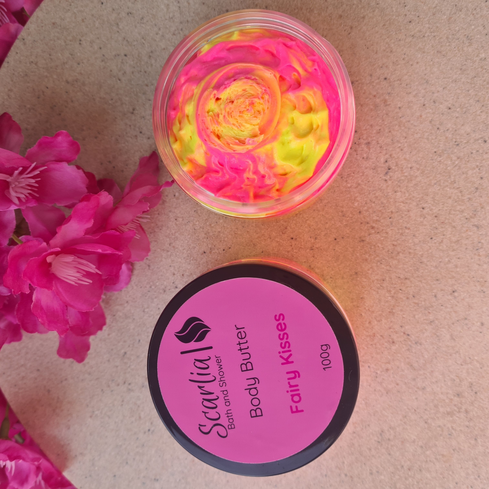 Indulge your skin in a touch of magic with our Fairy Kisses Body Butter. Crafted with nourishing butters and hydrating oils, this luxurious moisturiser melts effortlessly into the skin, leaving it silky smooth, deeply hydrated, and softly scented.