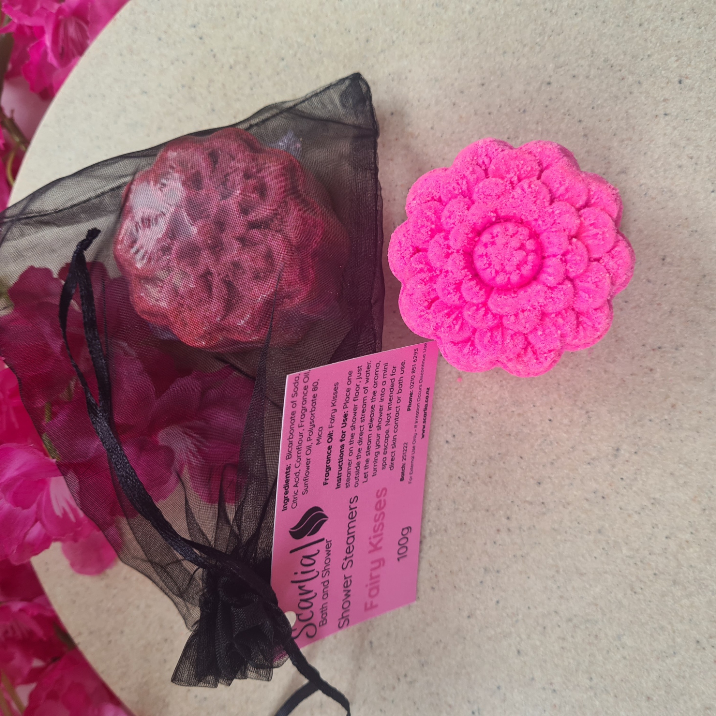 Remove the shower steamer from its wrapping and place it back into the organza bag provided. Once your shower is hot and steamy, activate the steamer by sprinkling it with a little water. Hang the bag from your shower head, tap, or a nearby hook – just make sure it’s not directly under the water flow. A light mist is all that’s needed to keep it gently fizzing and releasing its fragrance. Allow the steamer to dry between uses.