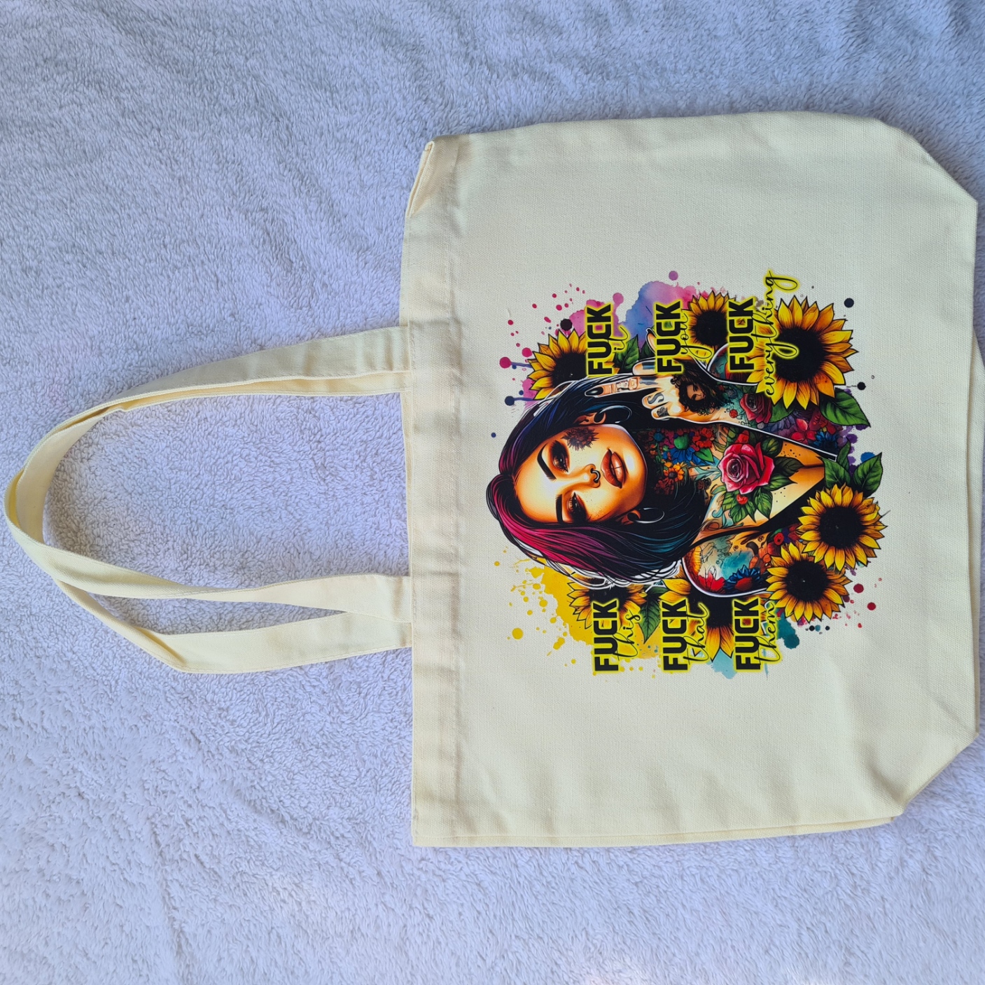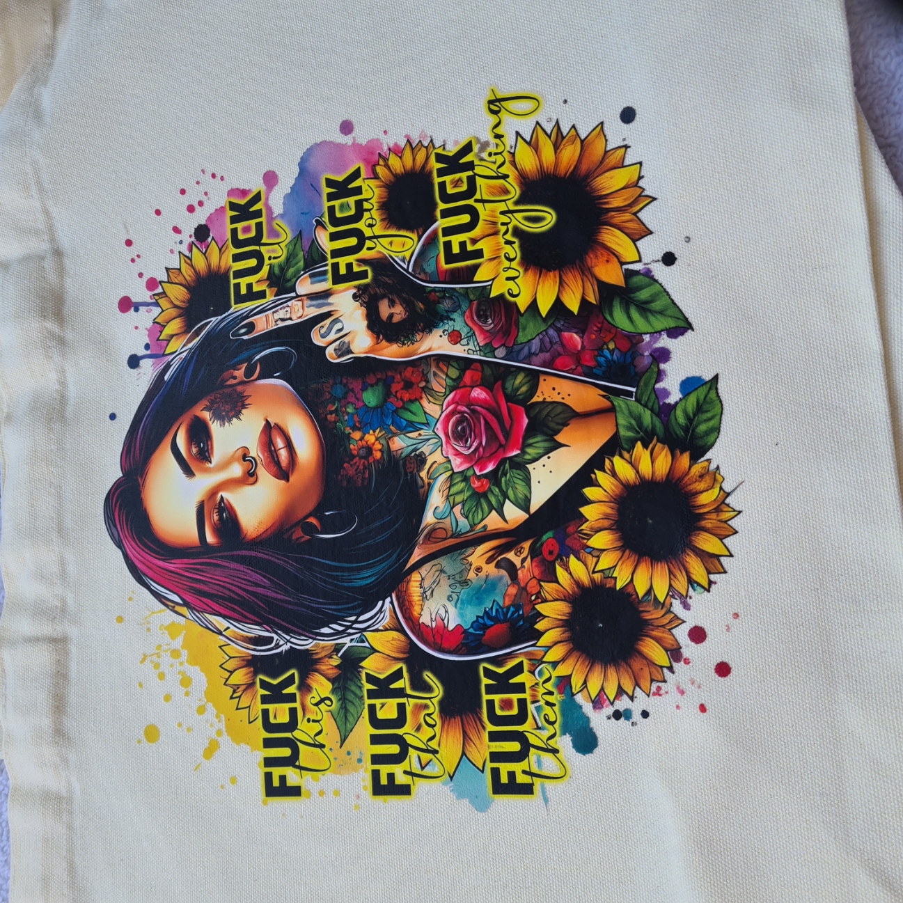 Make a statement with the Fuck Everything Tote Bag, featuring a striking design of a woman pulling the finger alongside bright sunflowers. Surrounded by the words “fuck this, fuck that, fuck them, fuck it, fuck you, fuck everything”, this tote is unapologetically bold and full of attitude.