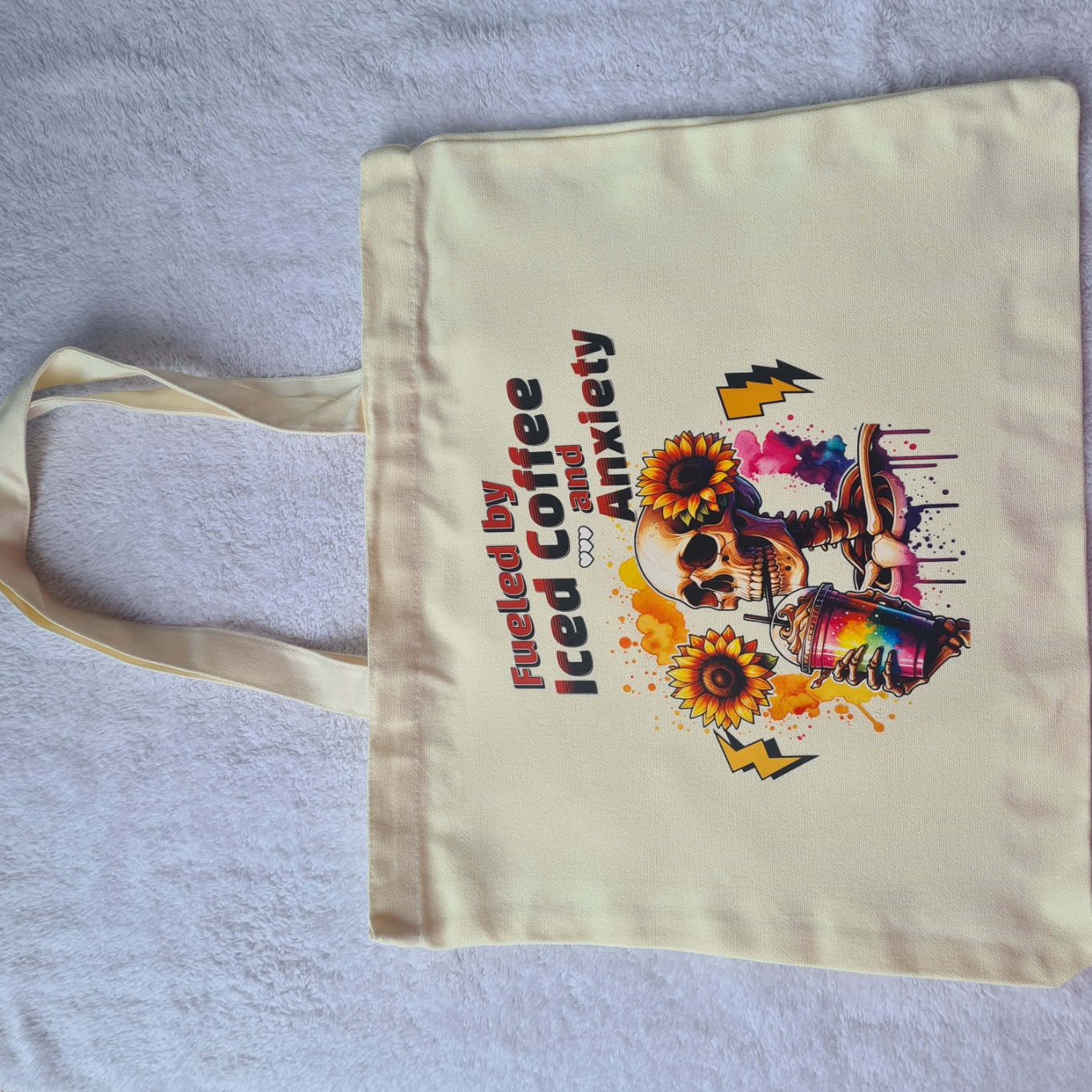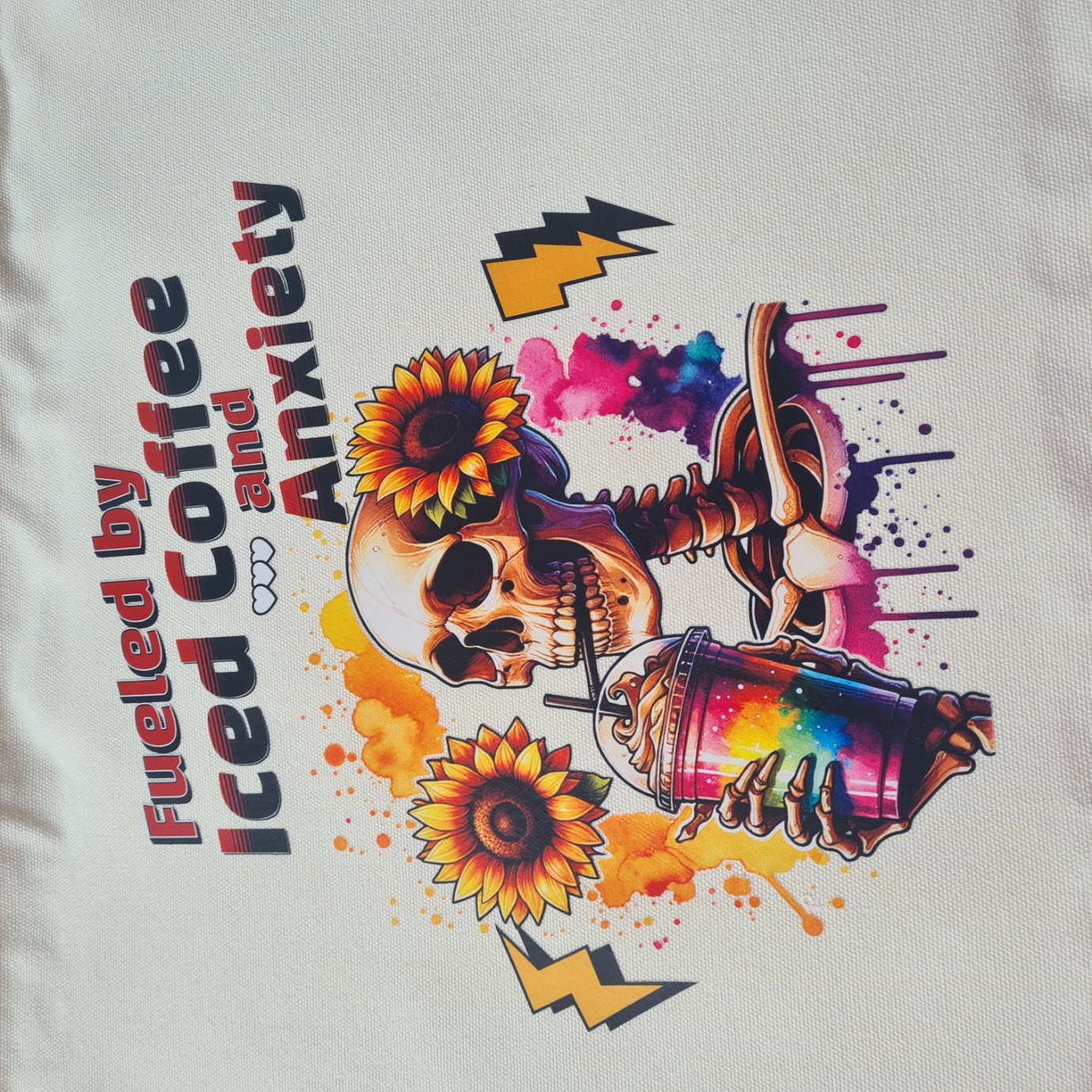 Show off your love for caffeine and dark humour with the Fueled by Iced Coffee and Anxiety Tote Bag! Featuring the cheeky phrase alongside a skeleton sipping iced coffee with a sunflower on its head, set against lightning bolts and colourful splotches, this tote blends quirky charm with a bold statement.