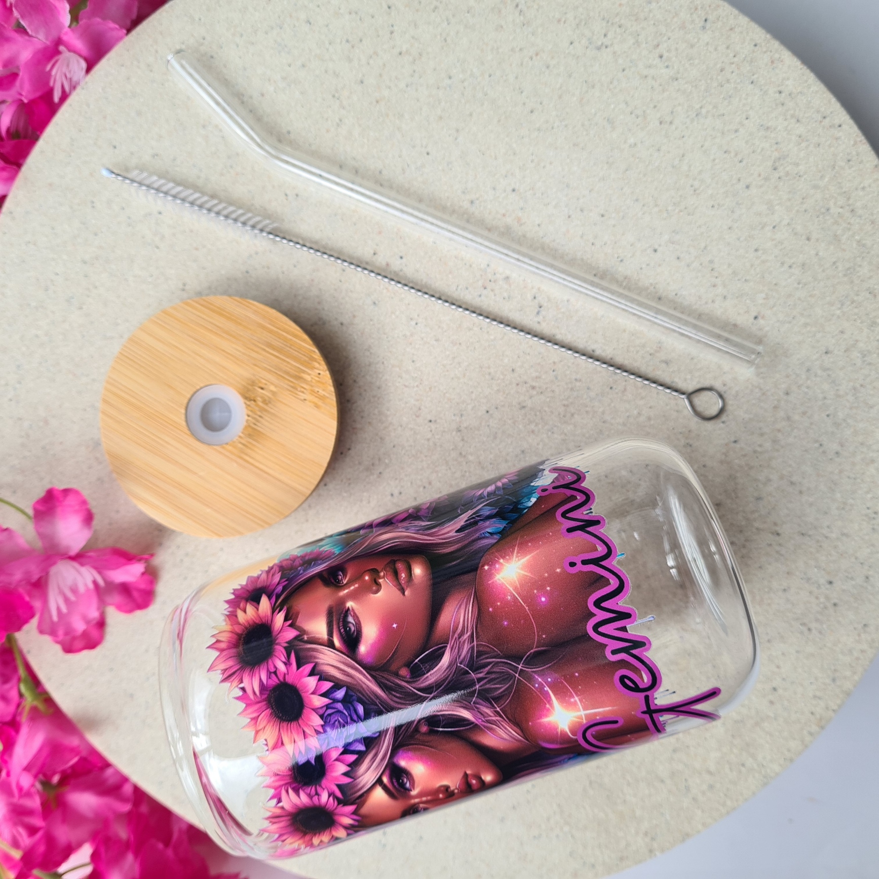 Celebrate your zodiac energy with our Gemini Glass Cup. Holding 460ml and measuring 13.5cm tall by 7cm wide, this cup blends elegance with a pink and purple celestial theme, perfect for sipping in style.