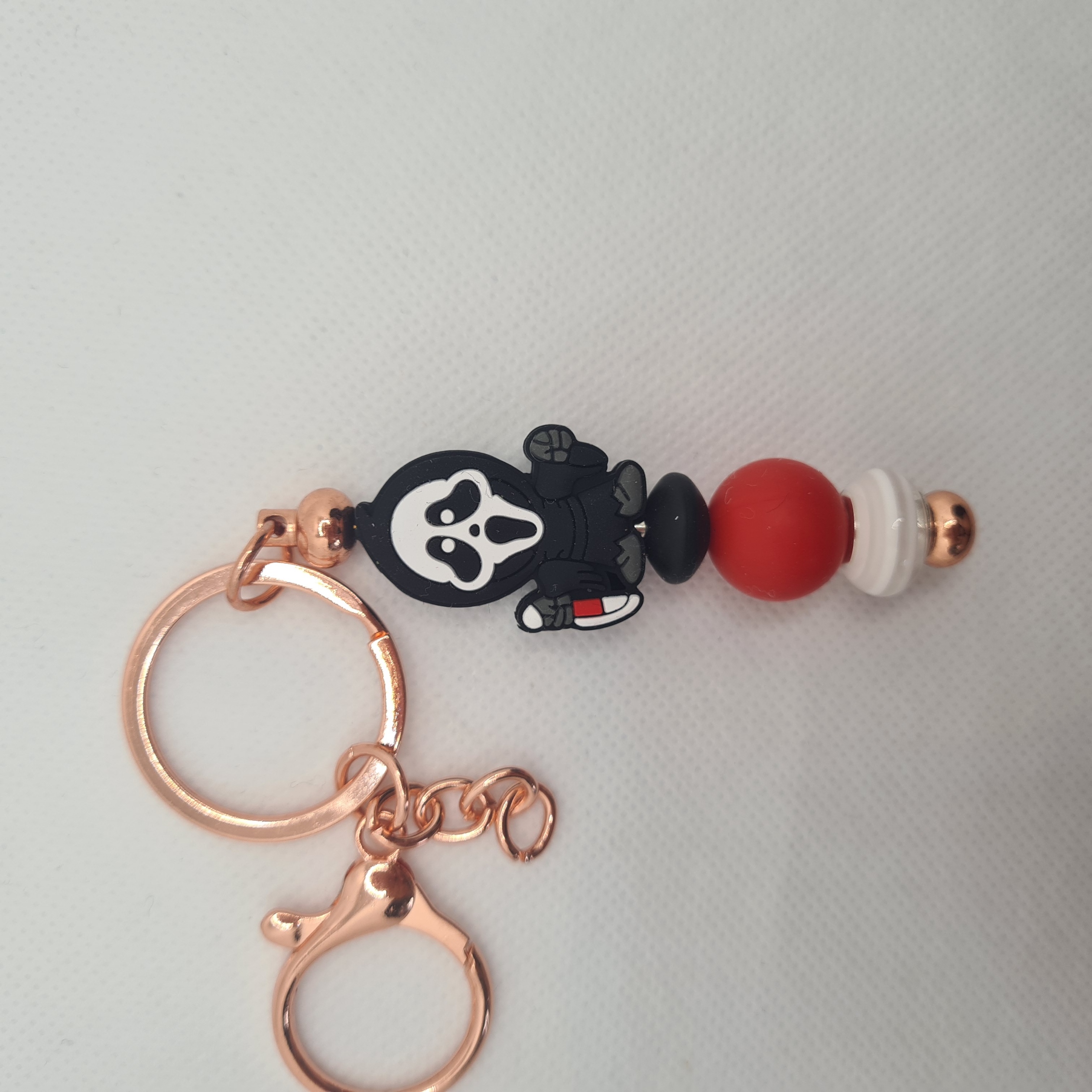 Add a spooky edge to your keys or bag with the Ghostface Silicone Bead Keychain. Featuring a bold Ghostface focal bead paired with sleek black, red and white beads, this keychain is perfect for horror lovers and fans of all things spooky.
