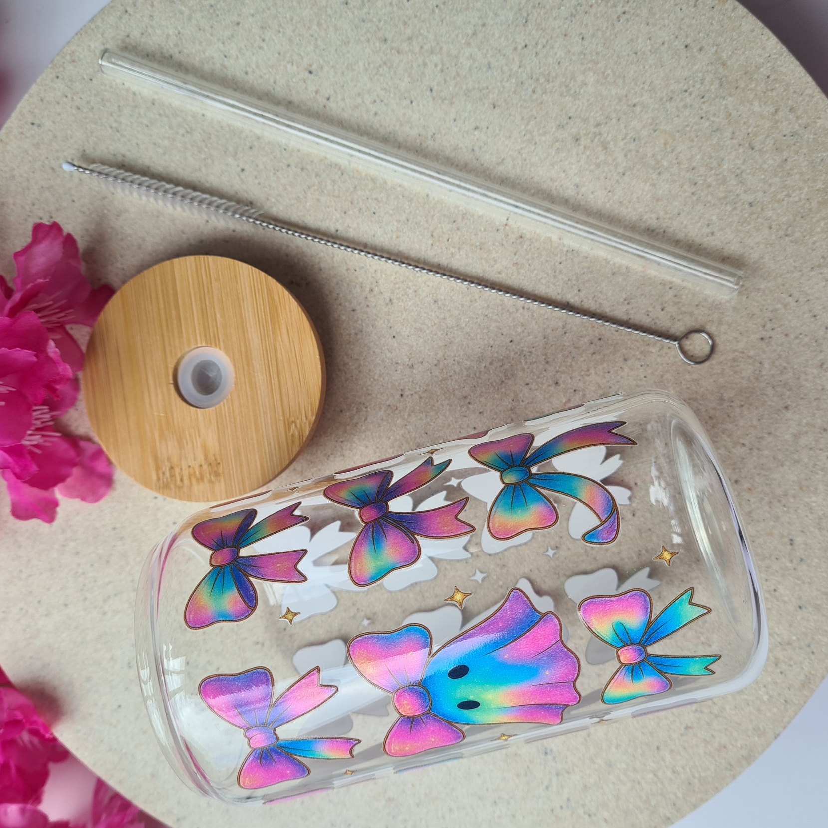 Add a playful twist to your spooky sips with our Ghosts and Bows Glass Cup. This 460ml glass features adorable ghosts paired with dainty bows in a dreamy pink, purple, and blue ombre design — the perfect mix of cute and spooky charm.