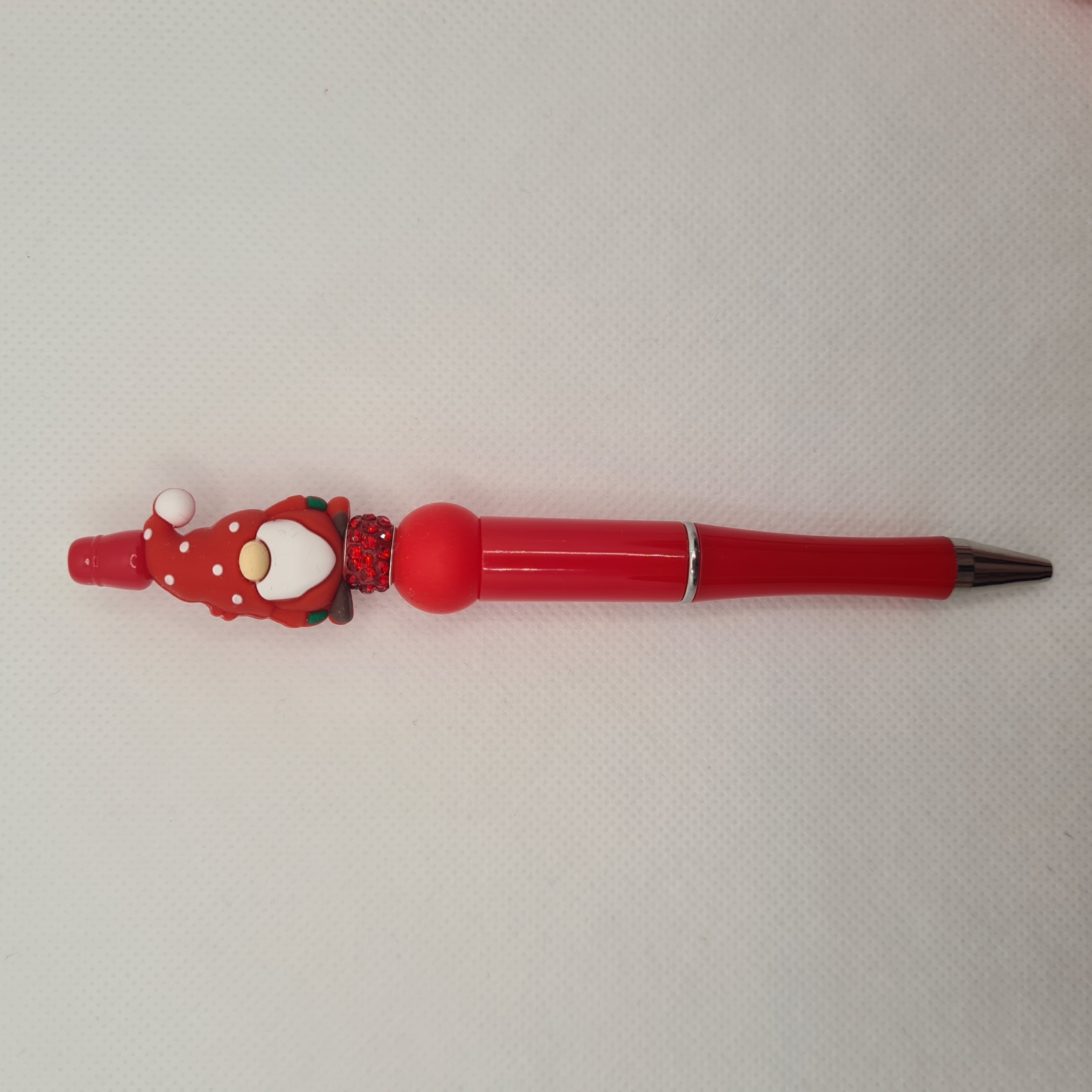 Bring a touch of whimsical charm to your writing with the Gnome Silicone Bead Pen. Featuring a vibrant red pen barrel, this pen showcases a round focal bead shaped like a red gnome wearing a matching red hat. A coordinating red silicone bead completes the playful design, while smooth black ink ensures a comfortable and easy writing experience.