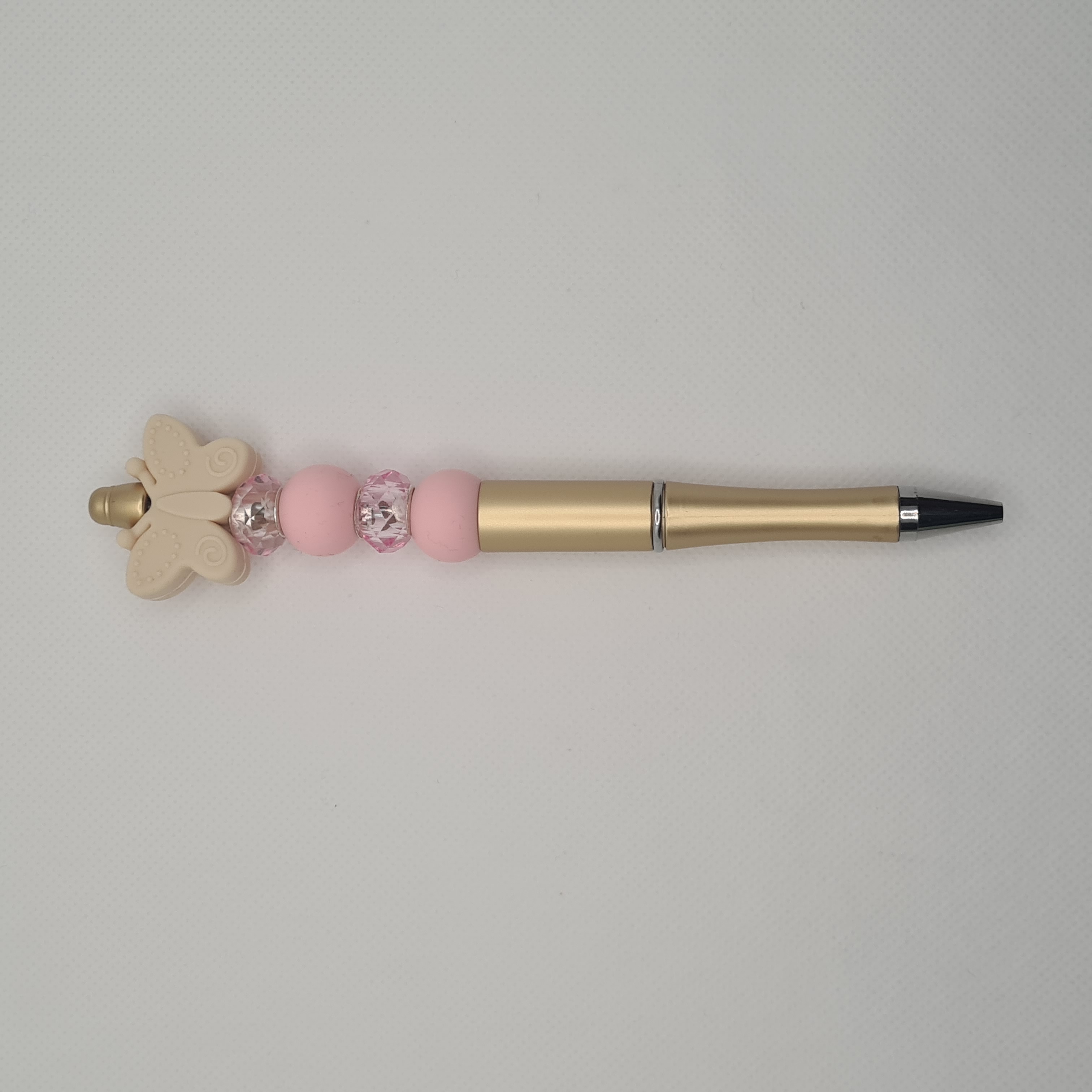 Add elegance and whimsy to your stationery with the Gold Butterfly Silicone Bead Pen. This gold pen features a light tan butterfly-shaped focal bead, complemented by soft pink silicone beads for a delicate and charming design. Smooth black ink makes it perfect for writing, journaling, or adding a touch of beauty to everyday tasks.
