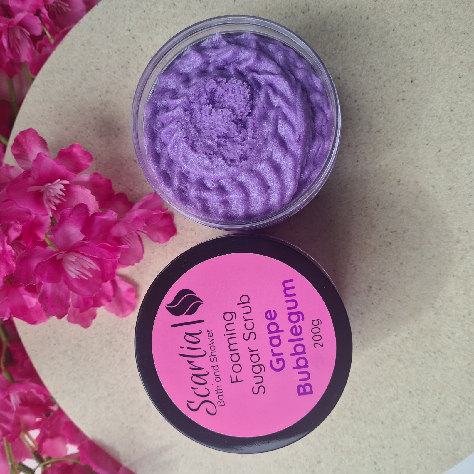 Get ready for a burst of nostalgia! Our Grape Bubblegum Foaming Sugar Scrub will take you back to childhood days of blowing the biggest bubbles and hoping they wouldn’t pop. This sweet and fruity blend of berries, grape, and creamy vanilla creates a deliciously playful scent you’ll love.