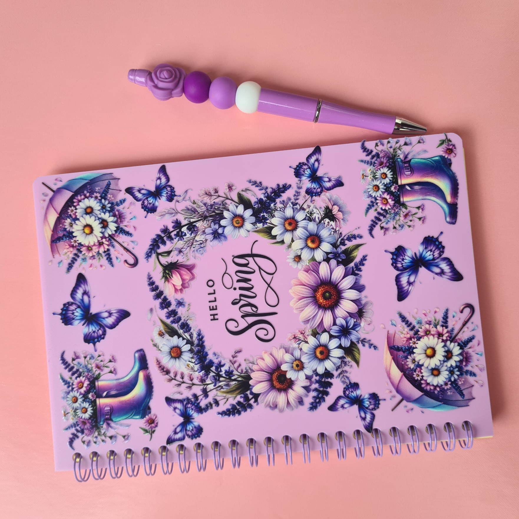 Notebook Design: Purple notebook with “hello spring” design featuring gumboots, umbrellas, flowers, and butterflies