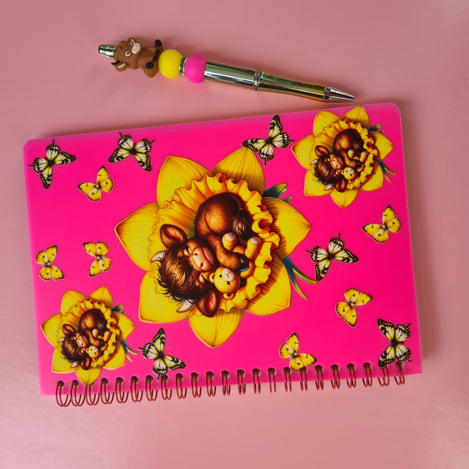 Notebook Design: Pink A5 notebook featuring a highland cow sleeping in a yellow flower with a teddy bear, plus extra yellow flowers