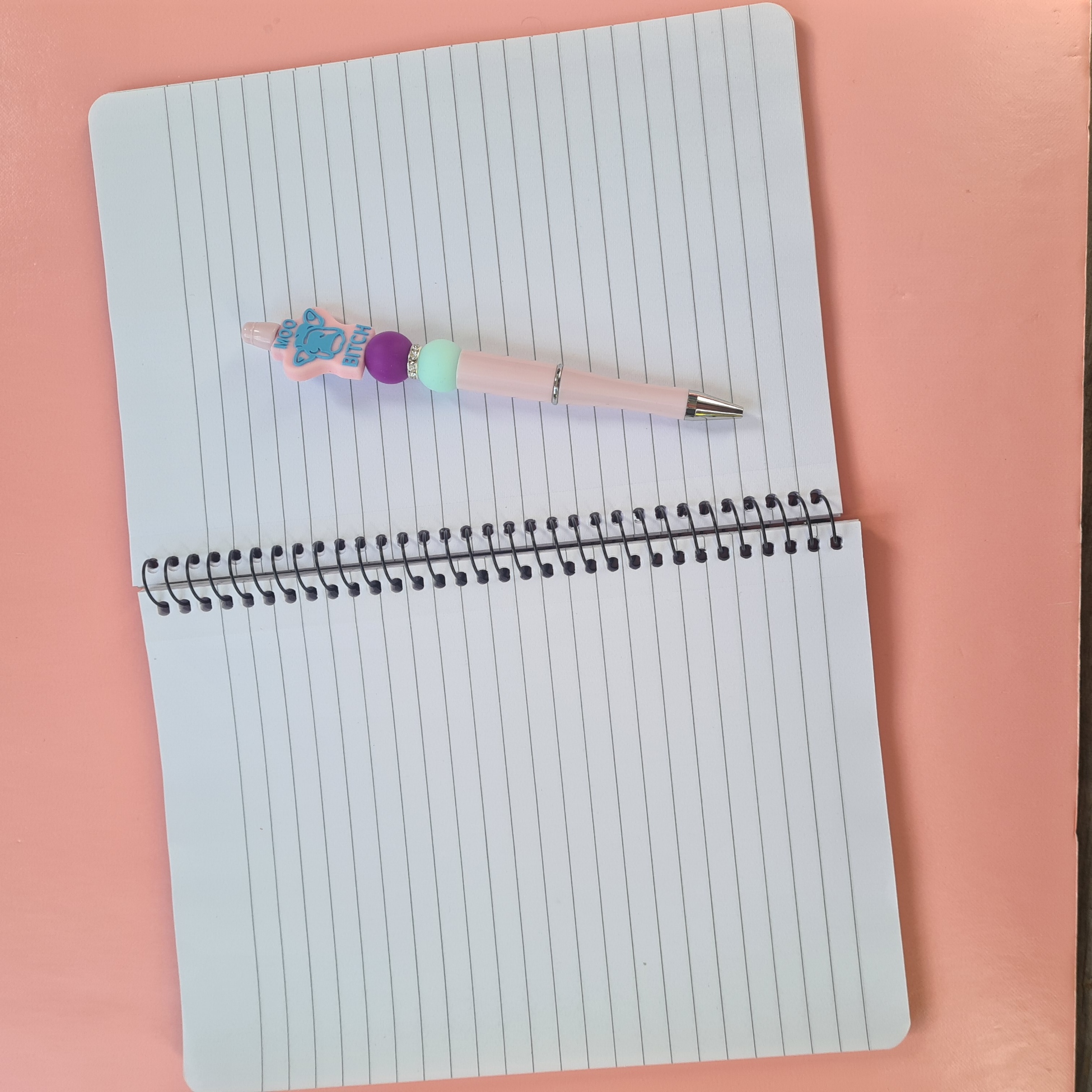 Paired with a matching pink pen, this bundle brings the sass full circle. The pen includes a cheeky bead with a cow outline that says “moo bitch,” along with purple and green accent beads — because even your writing accessories should have personality.