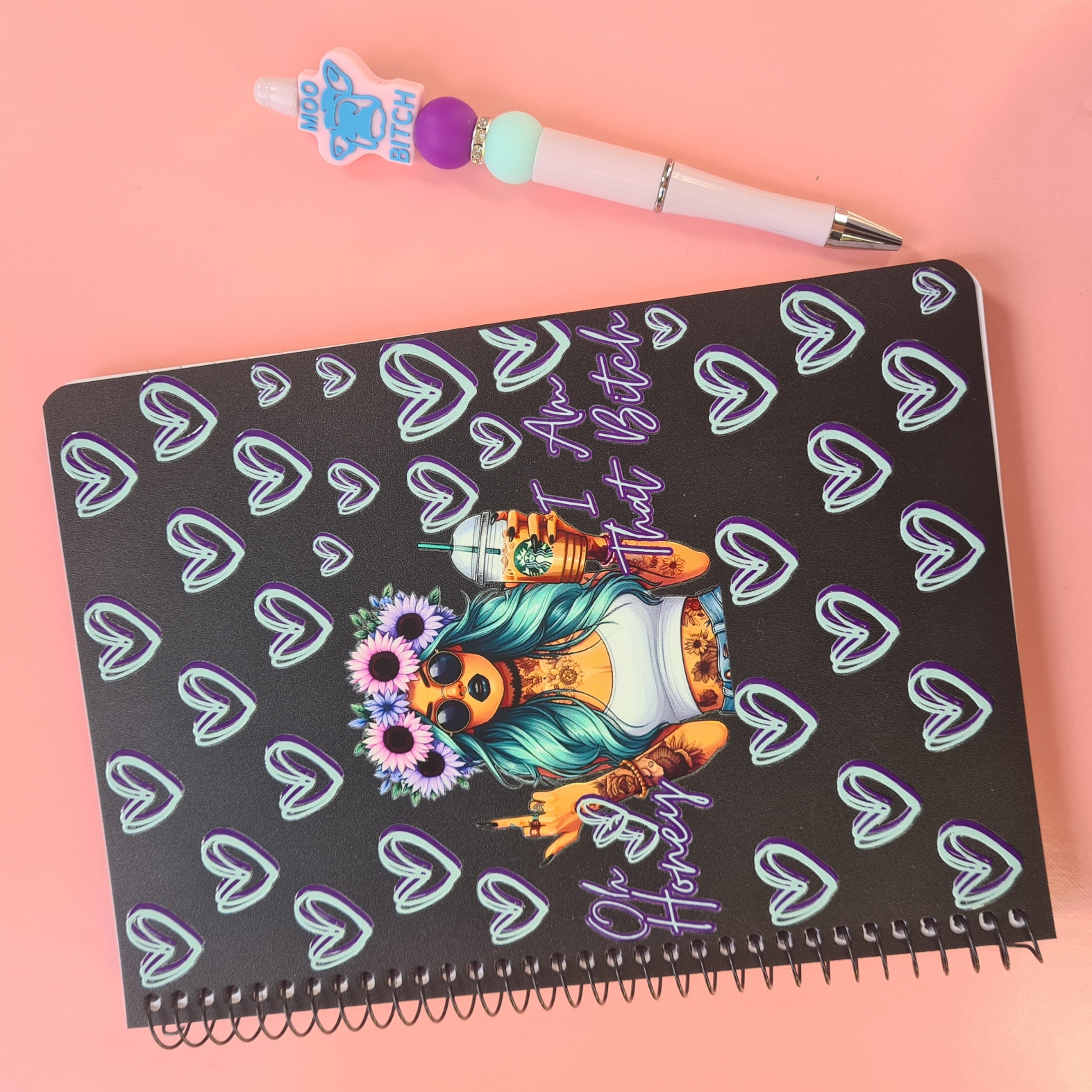 Notebook Design: Black notebook with a bold illustration of a woman flipping the finger with iced coffee, hearts, and the words “Oh honey, I am that bitch”