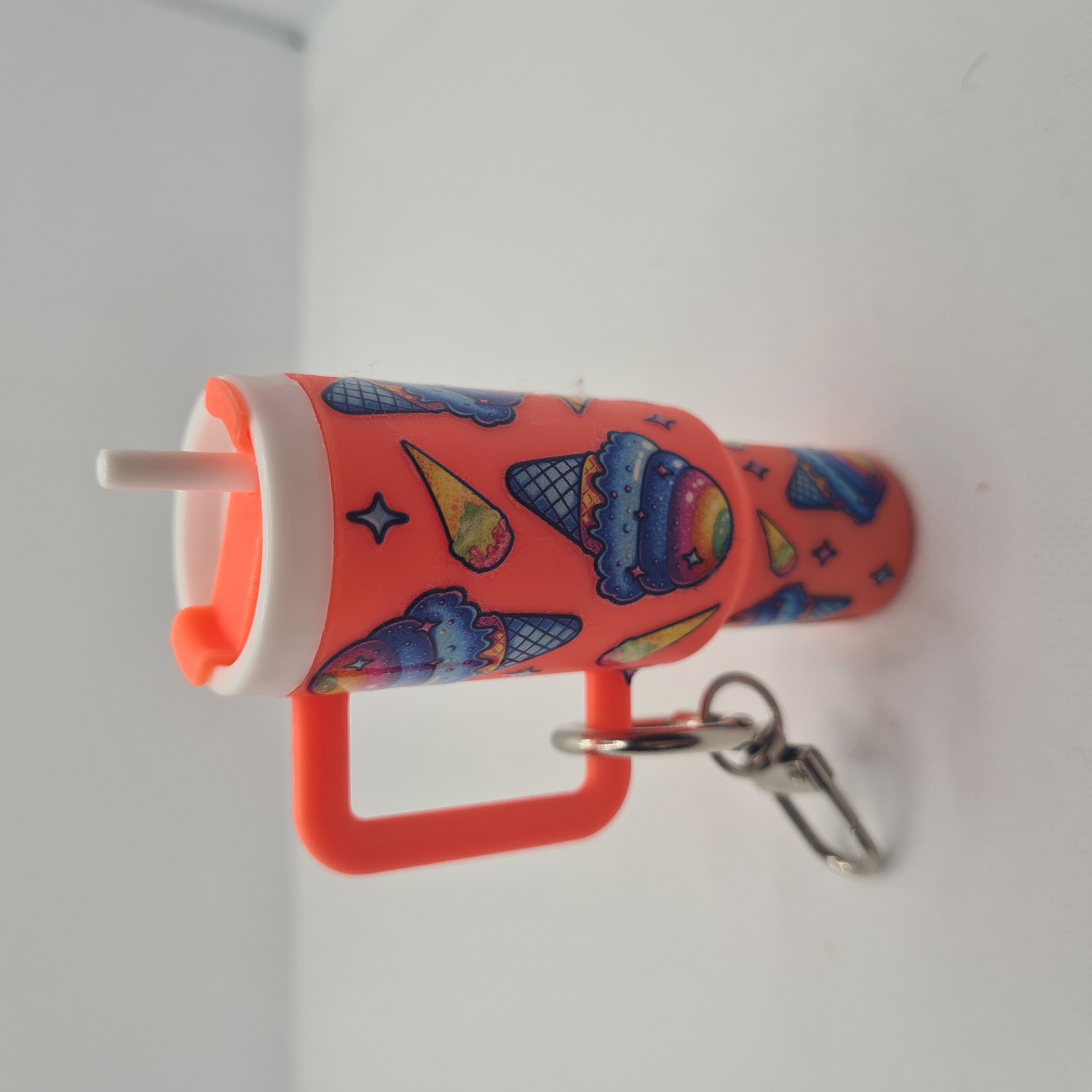Sweeten up your keys or bag with the Ice Cream Mini Tumbler Keychain. This bright orange tumbler-shaped keychain is covered in small, colourful ice cream cones, giving it a fun and playful look.