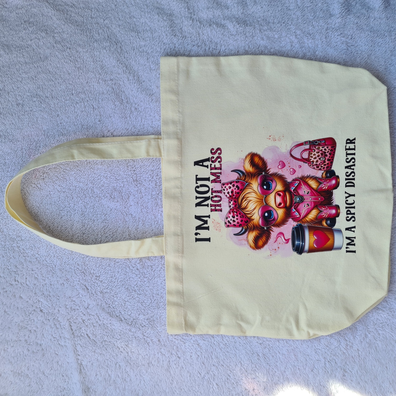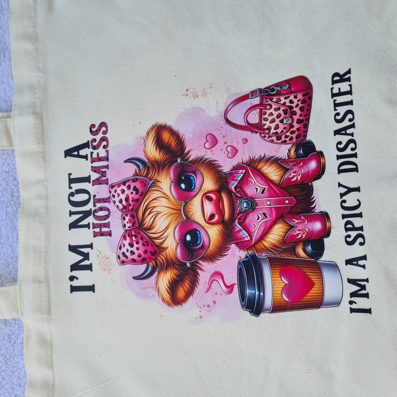 Make a bold (and adorable) statement with the I’m A Spicy Disaster Tote Bag! Featuring the cheeky phrase “I’m not a hot mess, I’m a spicy disaster”, this tote showcases a super cute highland cow dressed in a pink vest, cowgirl boots, heart-shaped glasses, and a bow. Complete with a bag and coffee cup by its side, this fun design blends sass with charm.