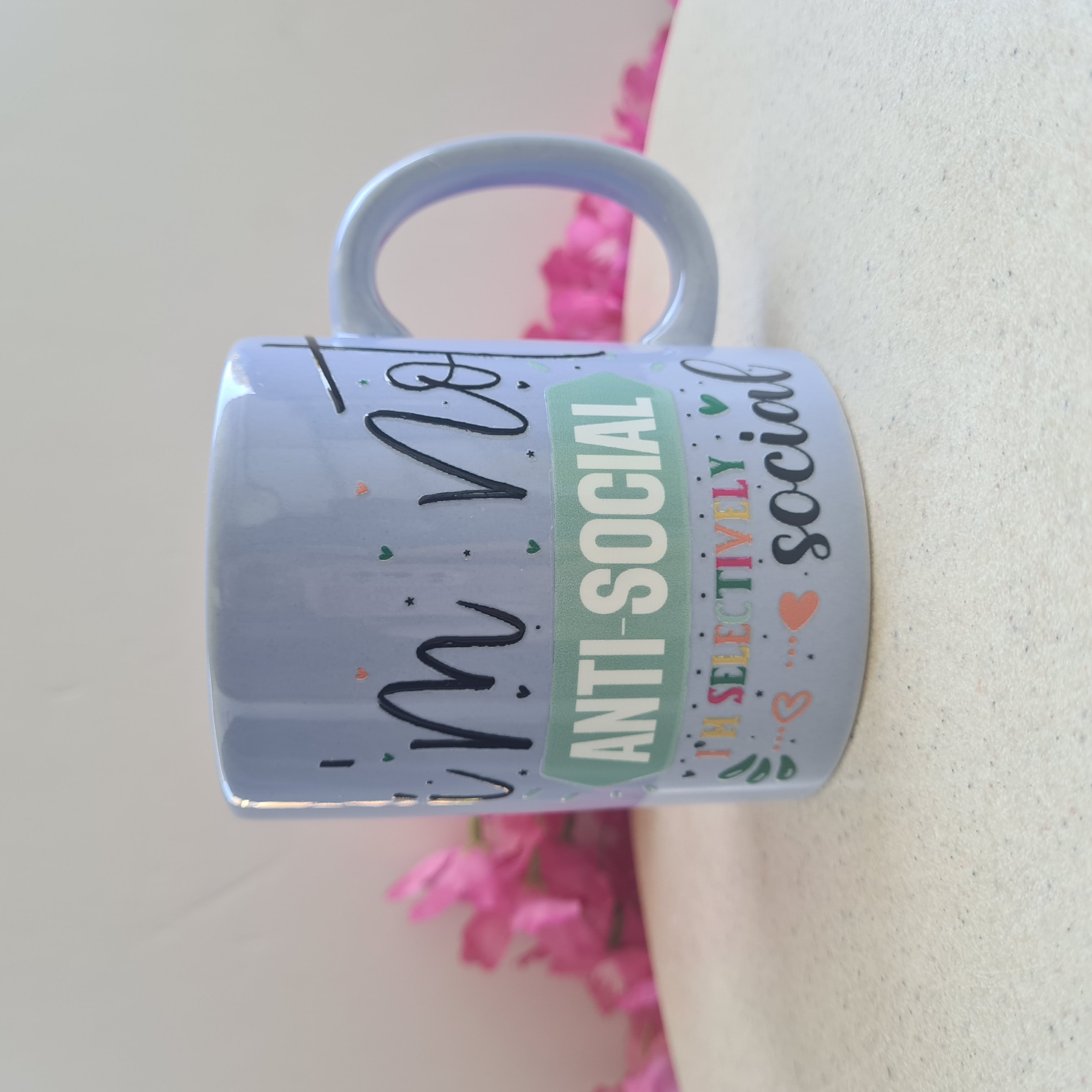 Design: Blue mug with the wording “I’m not anti-social, I’m selectively social”