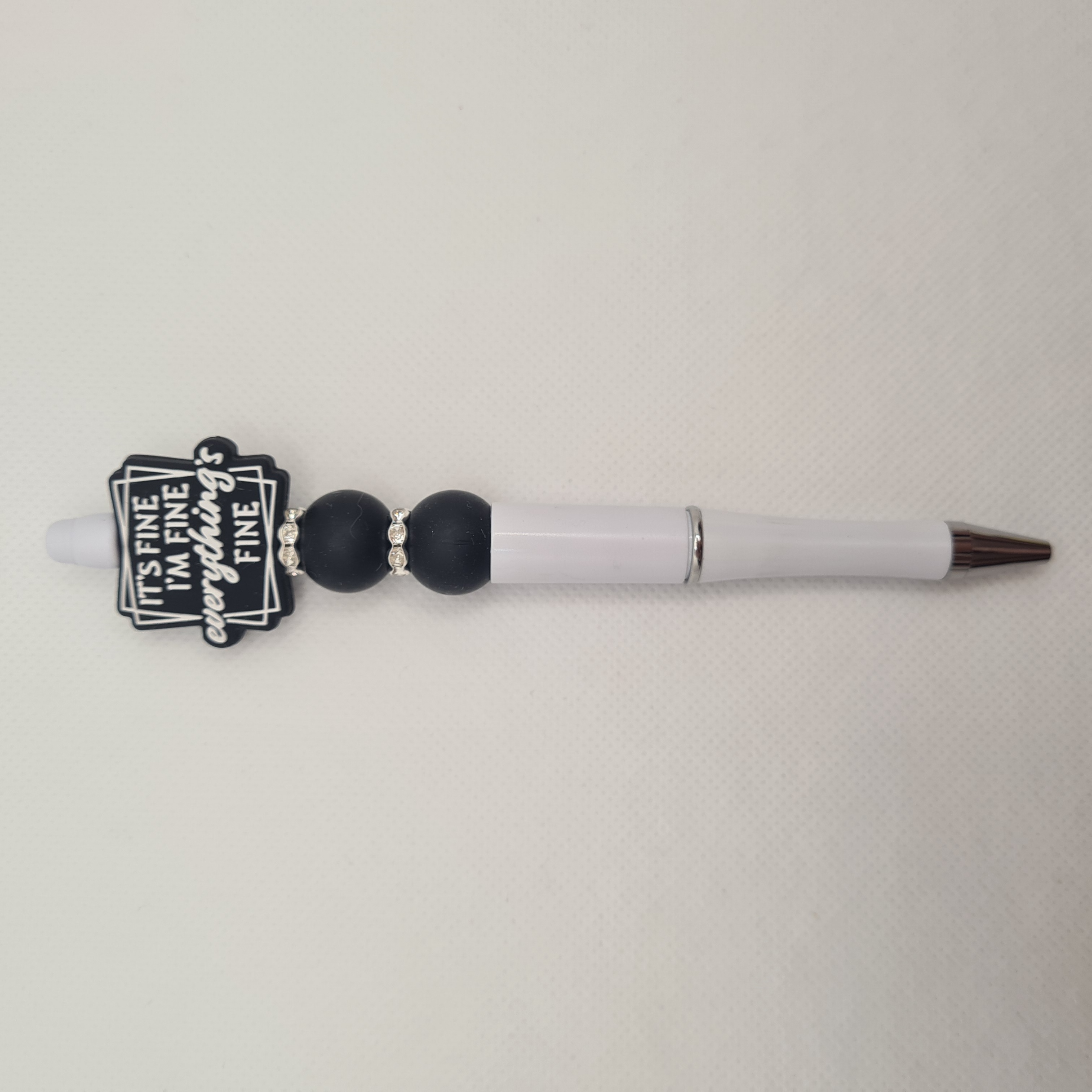 Add a touch of ironic humour to your stationery with the It’s Fine Silicone Bead Pen. Featuring a crisp white pen barrel, this pen showcases a round black focal bead with the phrase, “I’m fine, it’s fine, everything’s fine.” Black silicone accent beads complete the clean yet playful design, while smooth black ink makes it perfect for journaling, note-taking, or everyday writing.