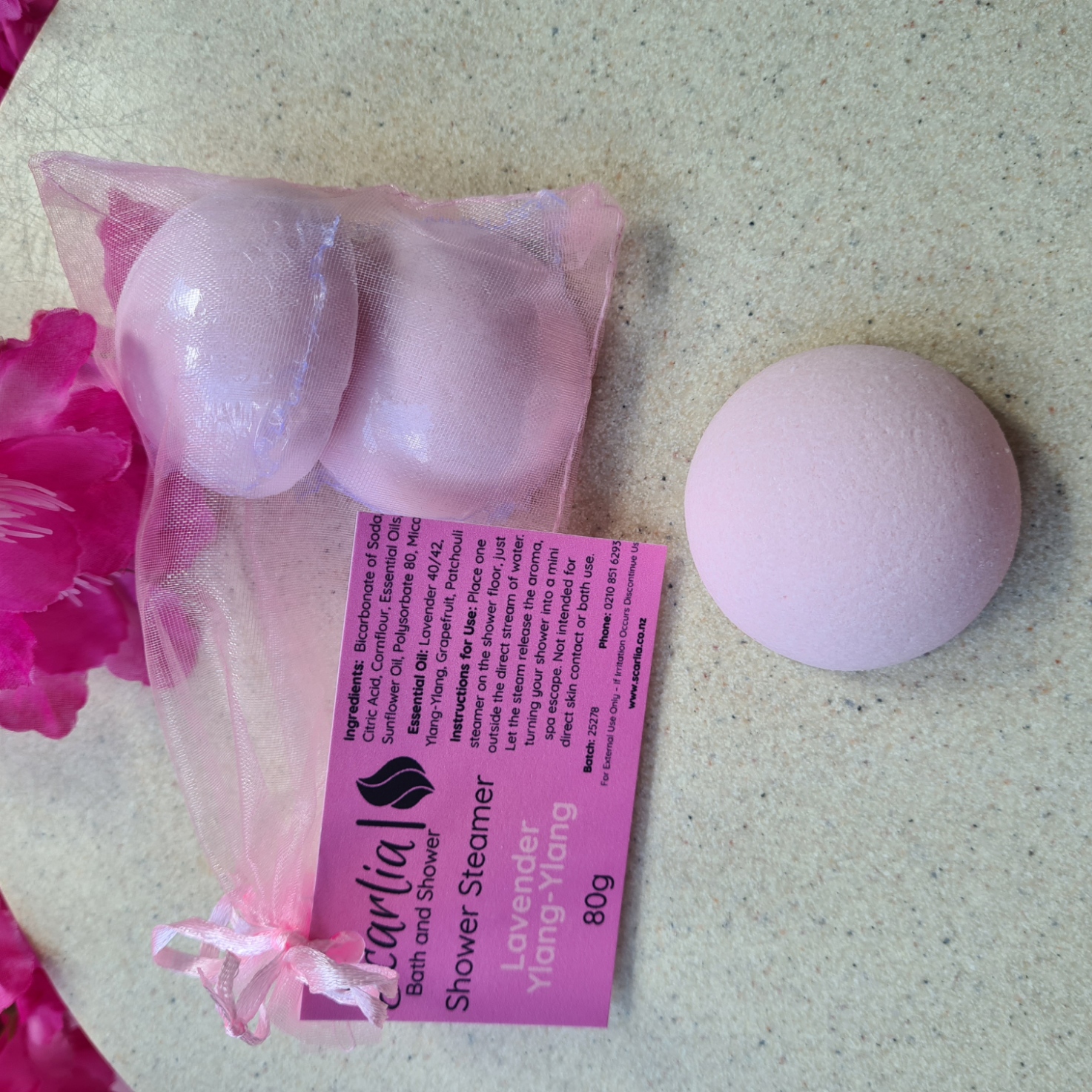 Remove the shower steamer from its wrapping and place it back into the organza bag provided. Once your shower is hot and steamy, activate the steamer by sprinkling it with a little water. Hang the bag from your shower head, tap, or a nearby hook – just make sure it’s not directly under the water flow. A light mist is all that’s needed to keep it gently fizzing and releasing its aroma. Allow the steamer to dry between uses.