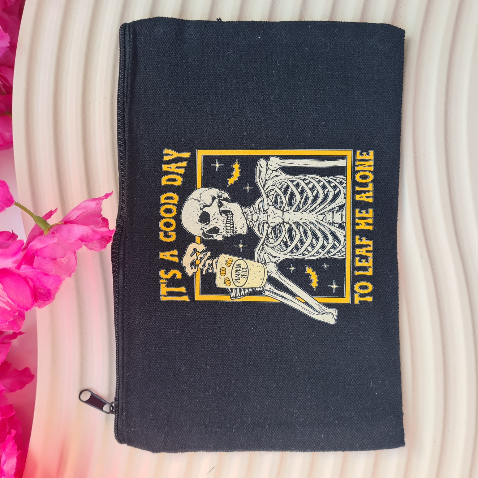 Add some spooky sass to your stationery with the Leaf Me Alone Pencil Case. Made from sturdy black canvas, it features the playful phrase “It’s a good day to leaf me alone” alongside a skeleton sipping a steaming cup of pumpkin spice. Perfect for autumn vibes (or year-round attitude), this case is just the right size to store your pens, pencils, or other small essentials. A secure black zip closure keeps everything neatly tucked away.