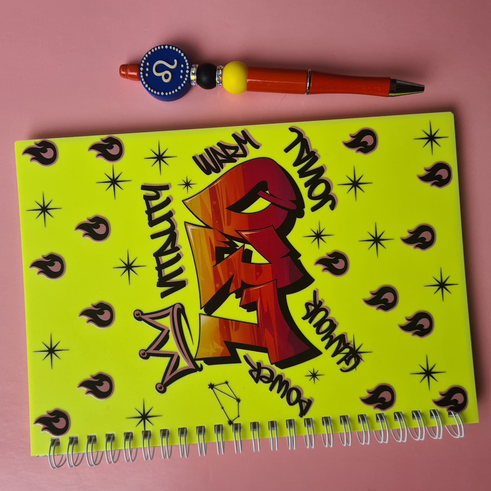 Notebook Design: A5 yellow notebook with Leo and bold personality words