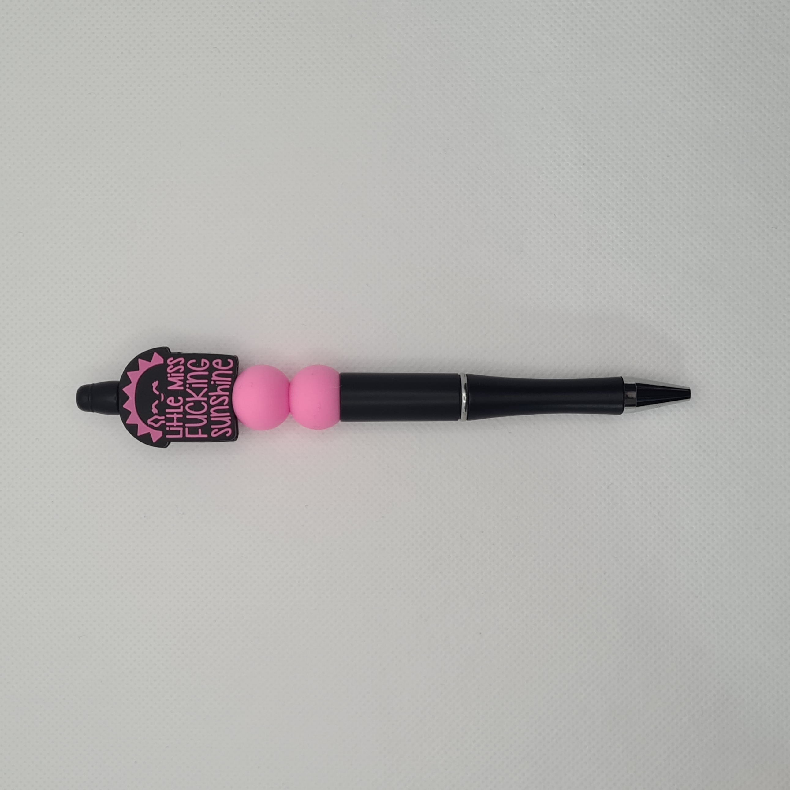 Add some unapologetic sass to your stationery with the Little Miss Fucking Sunshine Silicone Bead Pen. This bold black pen features a cheeky focal bead that says “Little Miss Fucking Sunshine” with a sun giving the finger — perfect for those days when sarcasm is your sunshine. Paired with pink silicone accent beads, this pen combines attitude and style while delivering smooth black ink for everyday writing.