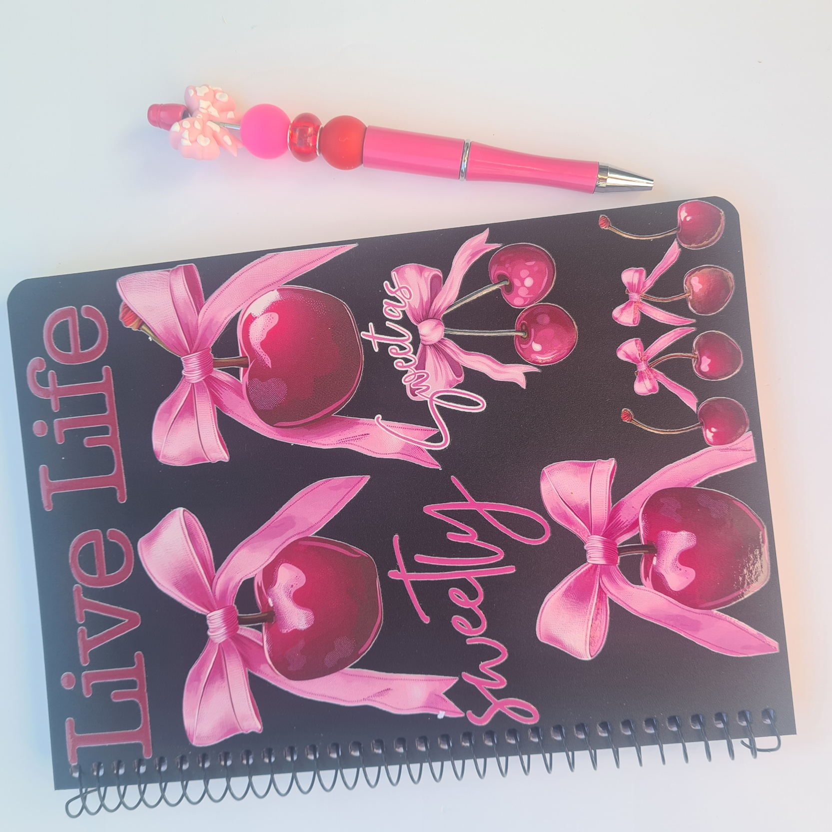 Notebook Design: Black A5 notebook featuring cherries with pink bows and the words “Live Life Sweetly” and “Sweet As”