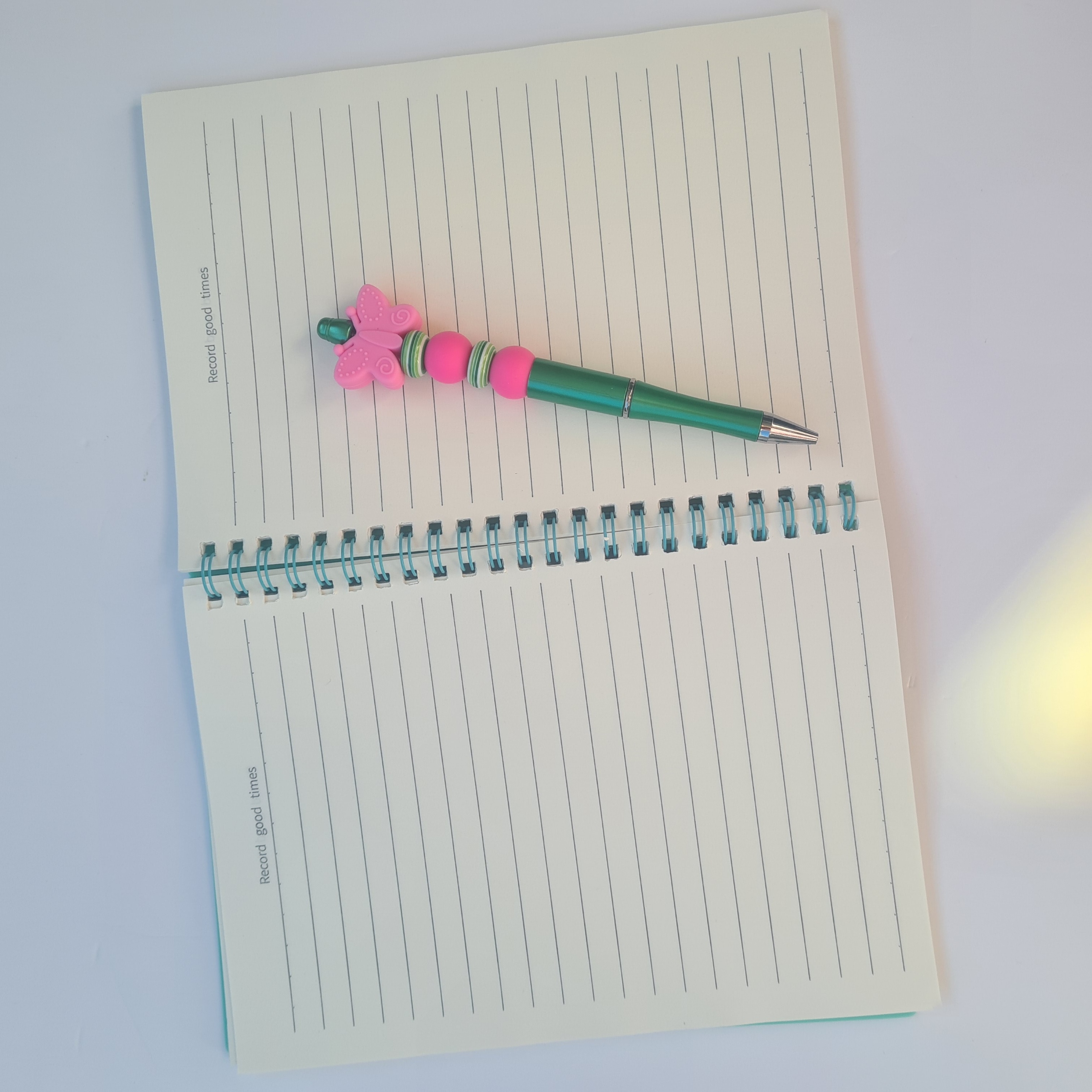 The set comes with a coordinating green pen, adorned with pink beads and a beautiful pink butterfly bead, adding a soft yet inspiring touch to your writing. Designed to keep you motivated while also being stylish, this bundle is ideal for anyone looking to bring positivity and purpose into their daily routine.
