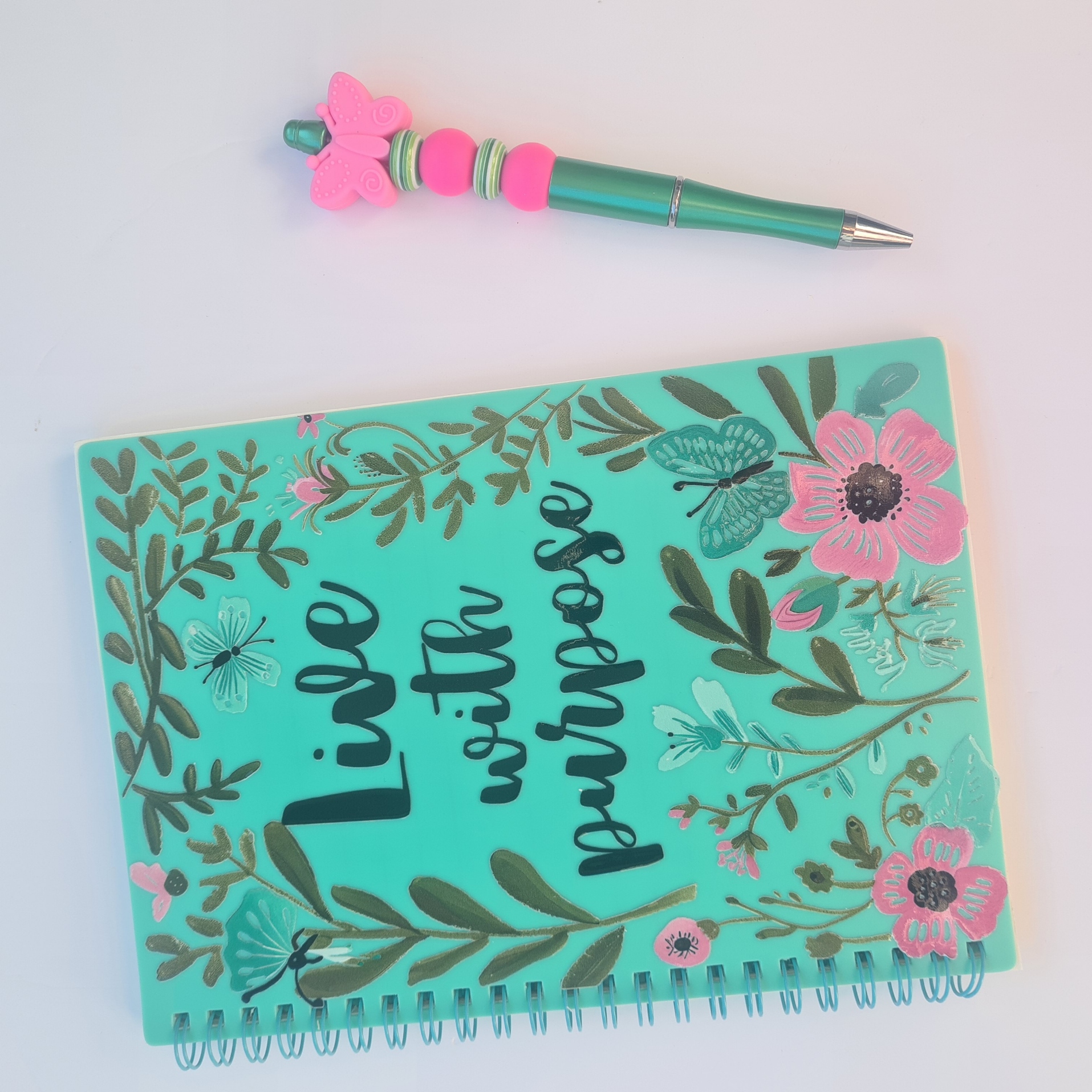 Notebook Design: Green A5 notebook featuring leaves, pink flowers, butterflies, and the words “Live With Purpose”