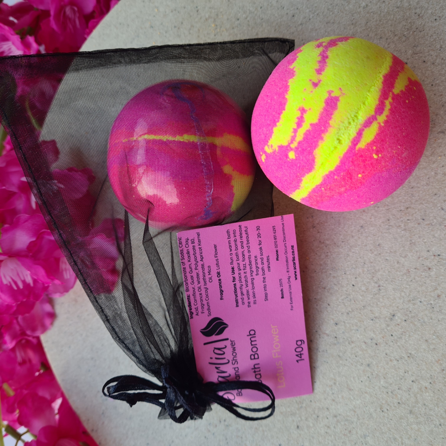 Ingredients: Bicarbonate of Soda, Citric Acid, Cornflour, Guar Gum, Kaolin Clay, Fragrance Oil (Lotus Flower), Water, Polysorbate 80, Sodium Cocoyl Isethionate, Apricot Kernel Oil, Mica.